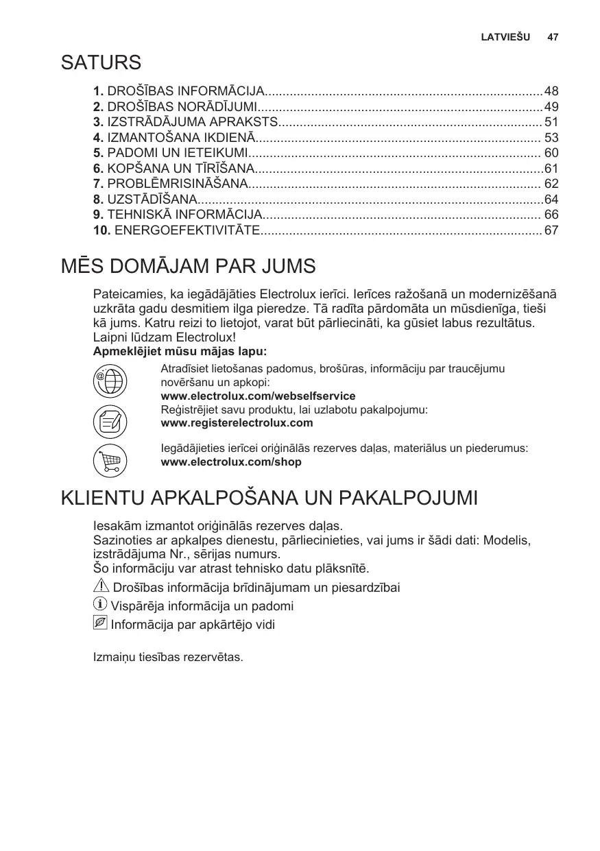 Pateicamies, ka iegādājāties Electrolux ierīci. Ierīces ražošanā un modernizēšanā uzkrāta gadu desmitiem ilga pieredze. Tā radīta pārdomāta un mūsdienīga, tieši kā jums. Katru reizi to lietojot, varat būt pārliecināti, ka gūsiet labus rezultātus. Laipni lūdzam Electrolux! Apmeklējiet mūsu mājas lapu: Atradīsiet lietošanas padomus, brošūras, informāciju par traucējumu novēršanu un apkopi: www.electrolux.com/webselfservice Reģistrējiet savu produktu, lai uzlabotu pakalpojumu: www.registerelectrolux.com Iegādājieties ierīcei oriģinālās rezerves daļas, materiālus un piederumus: www.electrolux.com/shop