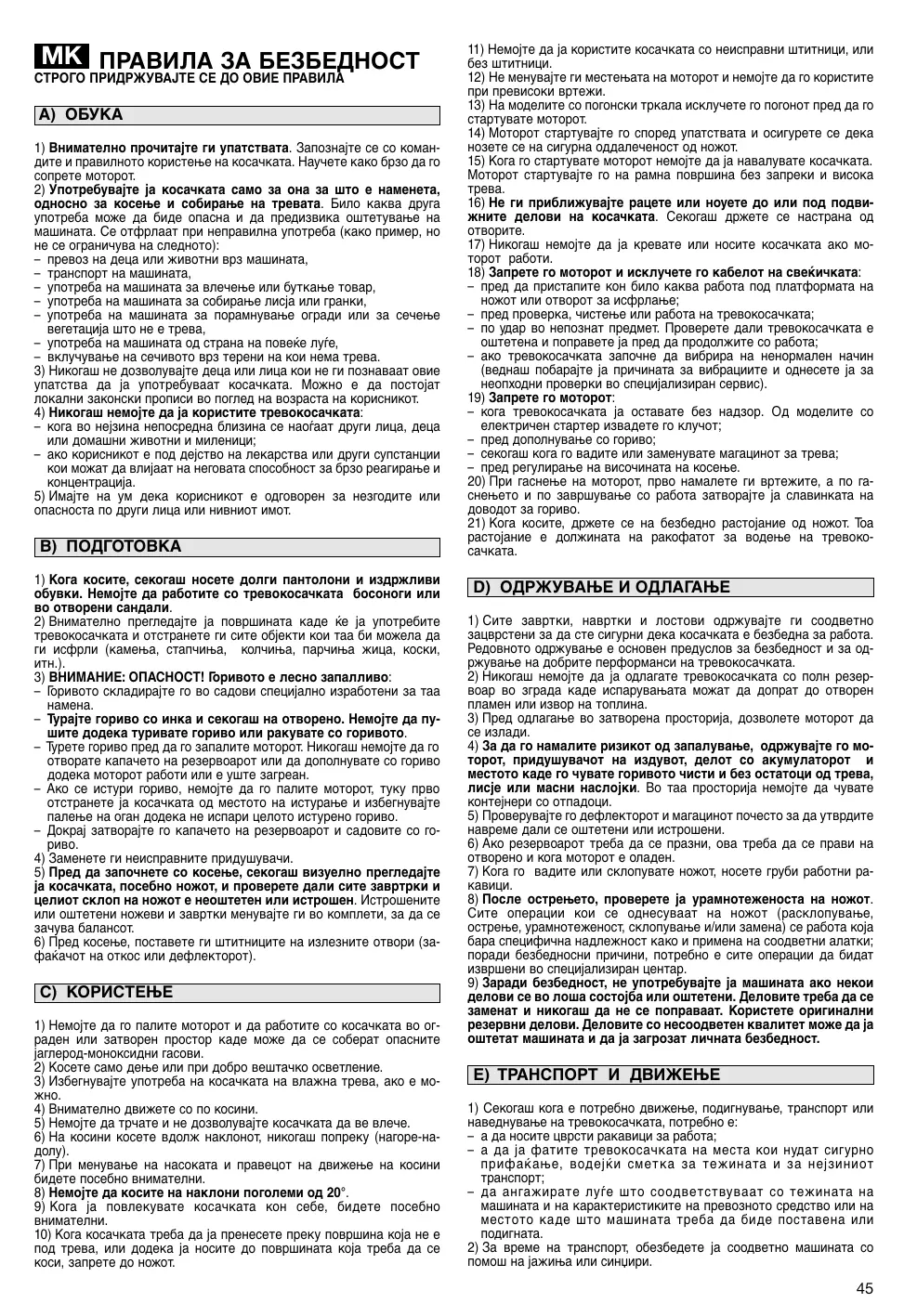D) ОДРЖУВАЊЕ И ОДЛАГАЊЕ 1) Сите завртки, навртки и лостови одржувајте ги соодветно зацврстени за да сте сигурни дека косачката е безбедна за работа. Редовното одржување е основен предуслов за безбедност и за одржување на добрите перформанси на тревокосачката. 2) Никогаш немојте да ја одлагате тревокосачката со полн резервоар во зграда каде испарувањата можат да допрат до отворен пламен или извор на топлина. 3) Пред одлагање во затворена просторија, дозволете моторот да се излади. 4) За да го намалите ризикот од запалување, одржувајте го моторот, придушувачот на издувот, делот со акумулаторот и местото каде го чувате горивото чисти и без остатоци од трева, лисје или масни наслојки. Во таа просторија немојте да чувате контејнери со отпадоци. 5) Проверувајте го дефлекторот и магацинот почесто за да утврдите навреме дали се оштетени или истрошени. 6) Ако резервоарот треба да се празни, ова треба да се прави на отворено и кога моторот е оладен. 7) Кога го вадите или склопувате ножот, носете груби работни ракавици. 8) После острењето, проверете ја урамнотеженоста на ножот. Сите операции кои се однесуваат на ножот (расклопување, острење, урамнотеженост, склопување и/или замена) се работа која бара специфична надлежност како и примена на соодветни алатки; поради безбедносни причини, потребно е сите операции да бидат извршени во специјализиран центар. 9) Заради безбедност, не употребувајте ја машината ако некои делови се во лоша состојба или оштетени. Деловите треба да се заменат и никогаш да не се поправаат. Користете оригинални резервни делови. Деловите со несоодветен квалитет може да ја оштетат машината и да ја загрозат личната безбедност.