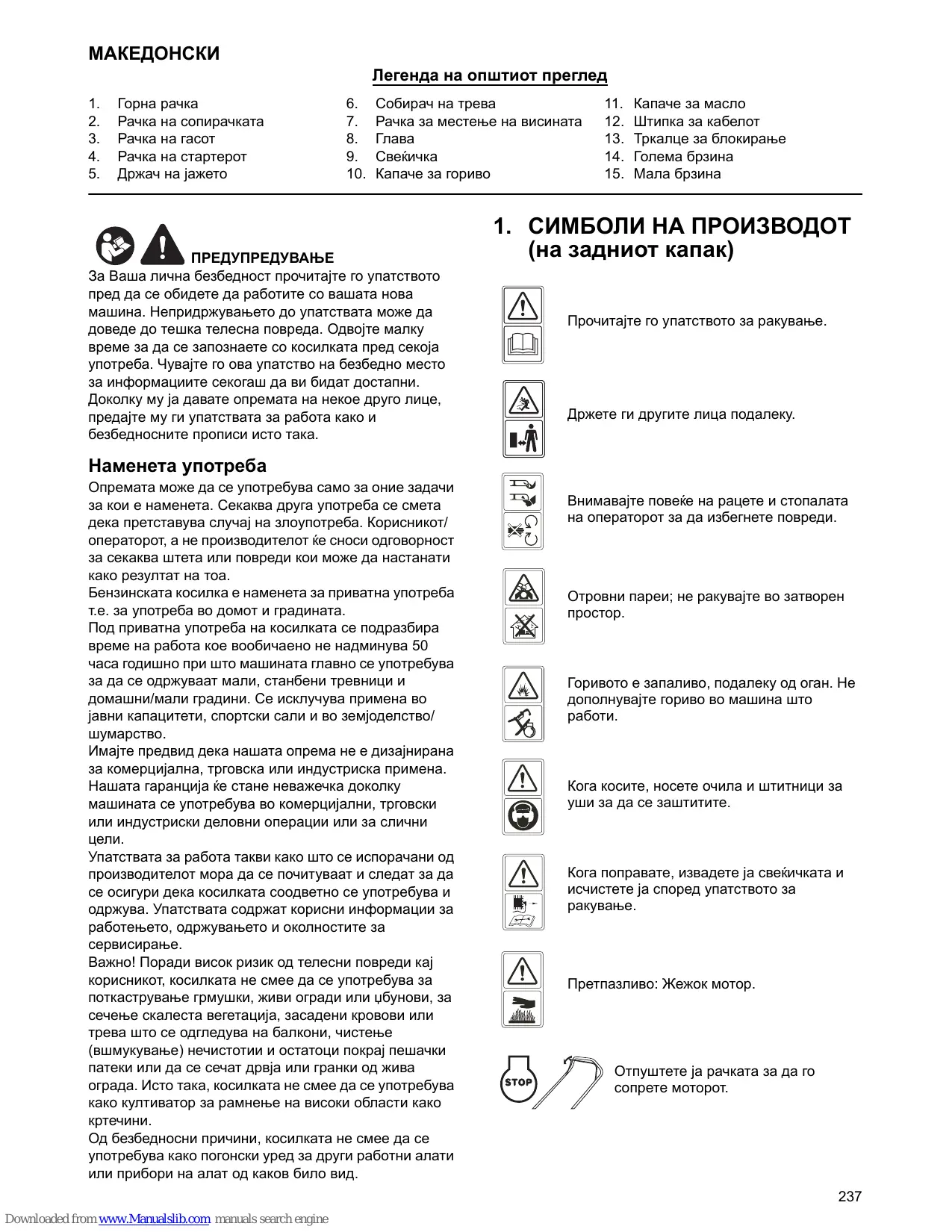 Downloaded from www.Manualslib.com manuals search engine - stockez le carburant dans des conteneurs conçus particulièrement à cet effet ; - remettez du carburant à l’extérieur uniquement et ne fumez pas pendant ce temps ; - ajoutez le carburant avant de démarrer le moteur. Ne retirez jamais le capuchon du réservoir de carburant et n’ajoutez pas d’essence lorsque le moteur tourne ou qu’il chauffe ; - si de l’essence coule, n’essayez pas de démarrer le moteur mais éloignez l’appareil de la zone où l’essence a coulé et évitez de faire des étincelles jusqu’à dissipation des vapeurs d’essence ; - revissez fermement tous les capuchons du réservoir et du conteneur. • Remplacez les pots d’échappement défectueux. • Avant l’utilisation, procédez toujours à une vérification générale pour vous assurer que les lames, les boulons de lame et l’ensemble de coupe ne sont ni usés ni endommagés. Remplacez les lames et boulons endommagés ou usés par lots complets pour préserver le bon équilibrage. • Vérifiez régulièrement pour vous assurer que tous les dispositifs de blocage du démarrage et les contrôleurs de présence de l’opérateur fonctionnent correctement.