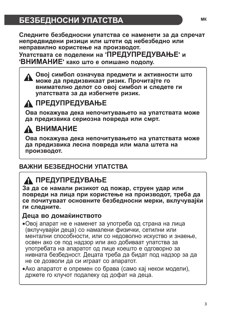 • Seadme paigutamisel veenduge, et toitekaabel ei takerdu ja seda ei kahjustata. • Ärge paigutage seadme taha mitmeid pikenduskaableid ega toiteseadmeid. ET ••Kui veejaoturi mahutis vett ei ole, ei saa jaoturi külma vee funktsiooni kasutada. Kontrollige, kas veejaoturi mahutis on vett ning seejärel täitke see, kui ei ole. ••Pärast vee võtmist oodale enne veepaagi eemaldamist vähemalt 15 sekundit. ••Helid veepaagist on vee jaoturisse andmisel tavapärased. See ei ole rikke tundemärgiks. ET • Nutitelefoni kasutusliides (UI) võib olla erinev olenevalt mobiili operatsioonisüsteemist (OS) ja tootjast. • Kui ruuteri turvaprotokoll on määratud WEP peale, võib võrgu üles seadmine ebaõnnestuda. Palun muutke see teiste turvaprotokollide peale (soovitav on WPA2) ja registreerige toode uuesti. CONSIGNES DE SÉCURITÉ 3