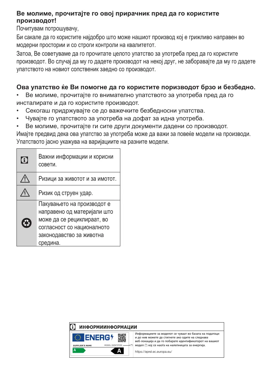 Ве молиме, прочитајте го овој прирачник пред да го користите производот! Почитувам потрошувачу, Би сакале да го користите најдобро што може нашиот производ кој е грижливо направен во модерни простории и со строги контроли на квалитетот. Затоа, Ве советуваме да го прочитате целото упатство за употреба пред да го користите производот. Во случај да му го дадете производот на некој друг, не заборавајте да му го дадете упатството на новиот сопственик заедно со производот. Ова упатство ќе Ви помогне да го користите поризводот брзо и безбедно. • Ве молиме, прочитајте го внимателно упатството за употреба пред да го инсталирате и да го користите производот. • Секогаш придржувајте се до важечките безбедносни упатства. • Чувајте го упатството за употреба на дофат за идна употреба. • Ве молиме, прочитајте ги сите други документи дадени со производот.