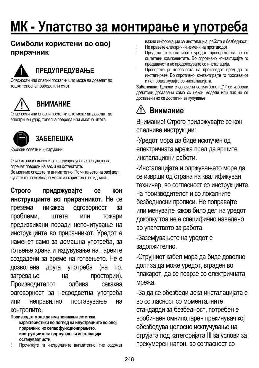 уредот автоматски го намалува нивото на моќност на зоните за готвење. Пред чистење или одржување, исклучете го производот од електричната мрежа со повлекување на приклучокот или исклучување на главниот прекинувач во домот. За сите операции на инсталирање и одржување секогаш користете работни ракавици Овој уред може да се користи од страна на деца на возраст над 8 години и лица со намалени психофизички и сензорни способности, или ако немаат искуство или знаење, доколку се под внимателен надзор или имаат добиено инструкции за безбедна употреба на апаратот и ги разбираат опасностите поврзани со него. Децата треба да се надгледуваат за да не си играат со уредот. Чистењето и одржувањето никогаш не треба да го прават деца доколку не се под соодветен надзор. Просторијата мора соодветно да се проветрува кога аспираторот се користи во исто време како други уреди за согорување, гас или друго. Аспираторот мора редовно да се чисти како внатрешно така и надворешно (НАЈМАЛКУ ЕДНАШ МЕСЕЧНО), со строго придржување кон инструкциите за одржување. Доколку не се следат правилата за чистење на аспираторот и замена и чистење на филтерот ќе доведе до опасност од пожар. 250