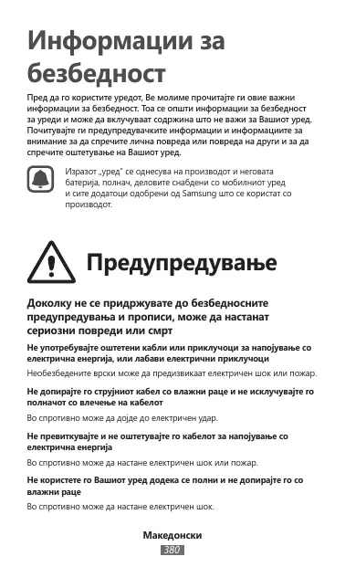 Информации за безбедност Пред да го користите уредот, Ве молиме прочитајте ги овие важни информации за безбедност. Тоа се општи информации за безбедност за уреди и може да вклучуваат содржина што не важи за Вашиот уред. Почитувајте ги предупредувачките информации и информациите за внимание за да спречите лична повреда или повреда на други и за да спречите оштетување на Вашиот уред. Изразот „уред“ се однесува на производот и неговата батерија, полнач, деловите снабдени со мобилниот уред и сите додатоци одобрени од Samsung што се користат со производот.