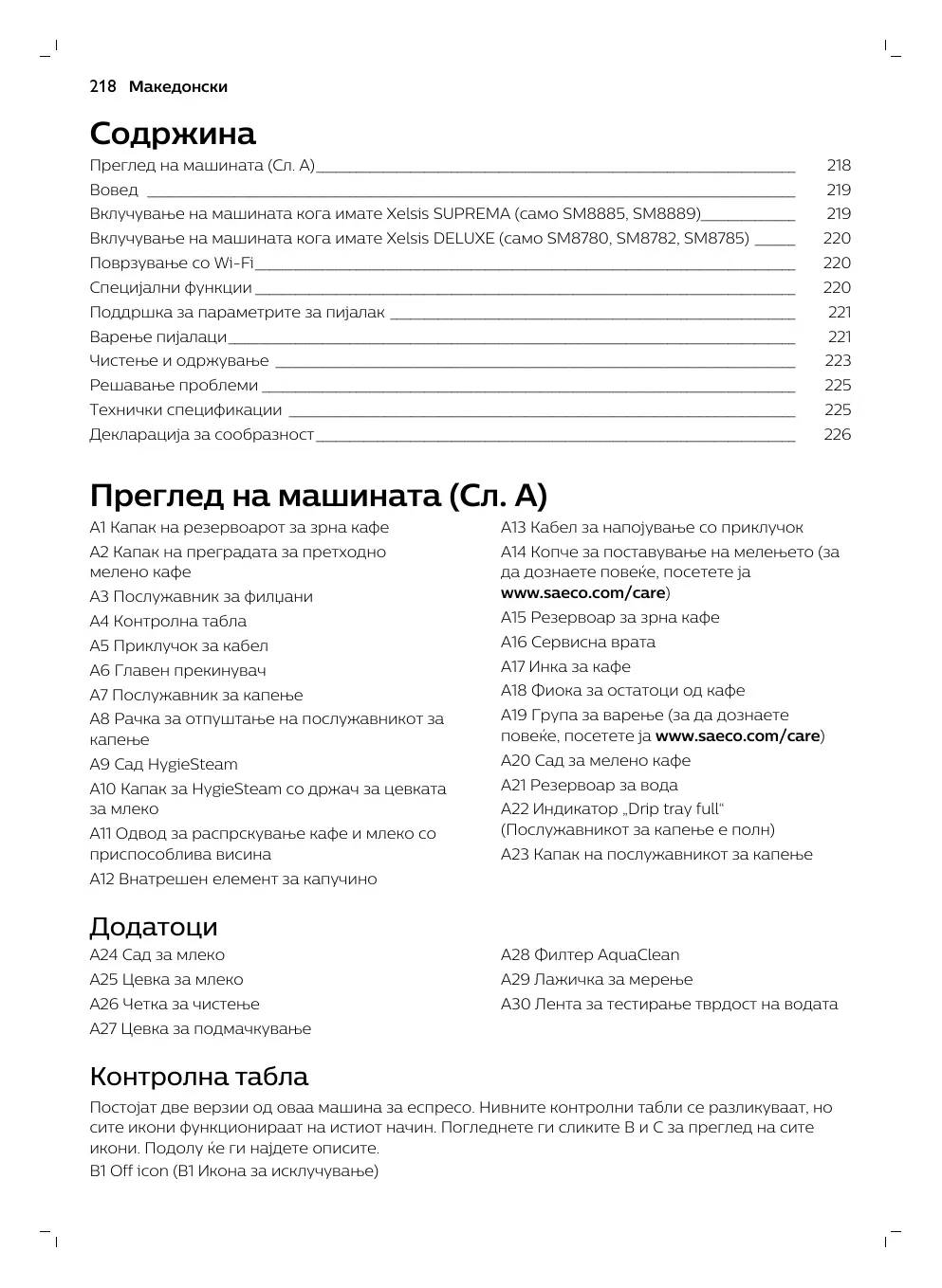 Вовед Ви честитаме што купивте целосно автоматска машина за кафе Saeco! Ова компактно корисничко упатство ќе ви помогне брзо да започнете со вашата нова машина за кафе. За да имате целосна корист од мрежната поддршка што ја нуди Saeco, може да ја користите контролната табла за да ја регистрирате вашата машина преку вградената Wi-Fi врска или да одите на www.saeco.com/MyCoffeeMachine и да го регистрирате го производот таму. Таму може да ги најдете и често поставуваните прашања, како и проширената верзија на прирачникот за корисникот. Внимателно прочитајте ја посебната безбедносна брошура пред првиот пат кога ќе ја користите машината и зачувајте ја за во иднина. Вашата целосно автоматска машина за кафе Saeco ви овозможува да се поврзете со Wi-Fi мрежата за подобро уживање на кафето. Со поврзување на вашата машина со Wi-Fi мрежата, ќе можете: - да добивате персонализирани препораки засновани на машинско учење; - да добивате редовни ажурирања на софтверот за да го подобрите вашето корисничко искуство; - да ја користите функционалноста на продавницата, доколку е достапна во вашата држава - да ја поврзете машината со вашата сметка на Amazon за дополнување на додатоците, доколку оваа можност е достапна во вашата држава - да се поврзете со вашиот домашен уред Alexa за да користите гласовна контрола, доколку е достапно во вашата земја. Забелешка: машинава е тестирана со кафе. Иако беше внимателно исчистена, може да има остатоци од кафе. Сепак, гарантираме дека машината е потполно нова.