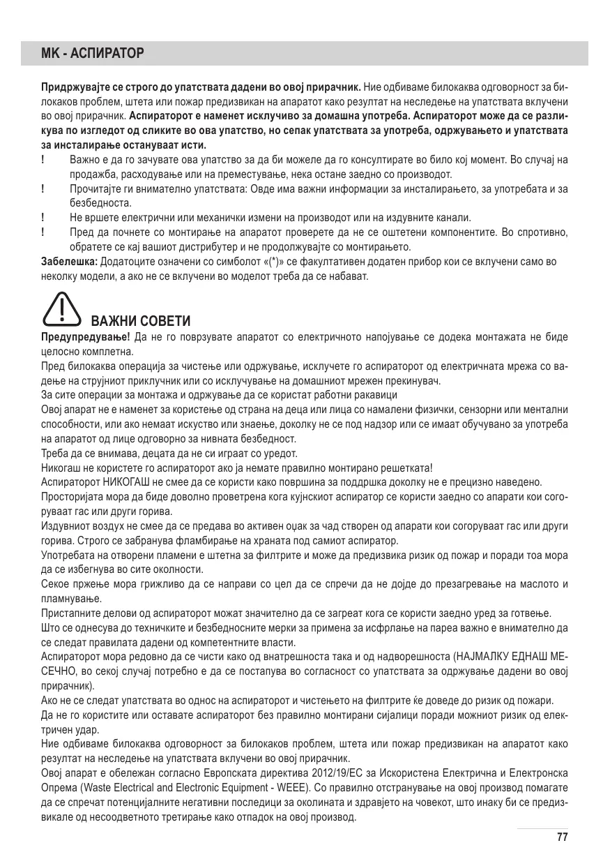 Предупредување! Да не го поврзувате апаратот со електричното напојување се додека монтажата не биде целосно комплетна. Пред билокаква операција за чистење или одржување, исклучете го аспираторот од електричната мрежа со вадење на струјниот приклучник или со исклучување на домашниот мрежен прекинувач. За сите операции за монтажа и одржување да се користат работни ракавици Овој апарат не е наменет за користење од страна на деца или лица со намалени физички, сензорни или ментални способности, или ако немаат искуство или знаење, доколку не се под надзор или се имаат обучувано за употреба на апаратот од лице одговорно за нивната безбедност. Треба да се внимава, децата да не си играат со уредот. Никогаш не користете го аспираторот ако ја немате правилно монтирано решетката! Аспираторот НИКОГАШ не смее да се користи како површина за поддршка доколку не е прецизно наведено. Просторијата мора да биде доволно проветрена кога кујнскиот аспиратор се користи заедно со апарати кои согоруваат гас или други горива. Издувниот воздух не смее да се предава во активен оџак за чад створен од апарати кои согоруваат гас или други горива. Строго се забранува фламбирање на храната под самиот аспиратор. Употребата на отворени пламени е штетна за филтрите и може да предизвика ризик од пожар и поради тоа мора да се избегнува во сите околности. Секое пржење мора грижливо да се направи со цел да се спречи да не дојде до презагревање на маслото и пламнување. Пристапните делови од аспираторот можат значително да се загреат кога се користи заедно уред за готвење. Што се однесува до техничките и безбедносните мерки за примена за исфрлање на пареа важно е внимателно да се следат правилата дадени од компетентните власти. Аспираторот мора редовно да се чисти како од внатрешноста така и од надворешноста (НАЈМАЛКУ ЕДНАШ МЕСЕЧНО, во секој случај потребно е да се постапува во согласност со упатствата за одржување дадени во овој прирачник). Ако не се следат упатствата во однос на аспираторот и чистењето на филтрите ќе доведе до ризик од пожари. Да не го користите или оставате аспираторот без правилно монтирани сијалици поради можниот ризик од електричен удар. Ние одбиваме билокаква одговорност за билокаков проблем, штета или пожар предизвикан на апаратот како резултат на неследење на упатствата вклучени во овој прирачник. Овој апарат е обележан согласно Европската директива 2012/19/EC за Искористена Електрична и Електронска Опрема (Waste Electrical and Electronic Equipment - WEEE). Со правилно отстранување на овој производ помагате да се спречат потенцијалните негативни последици за околината и здравјето на човекот, што инаку би се предизвикале од несоодветното третирање како отпадок на овој производ. 77