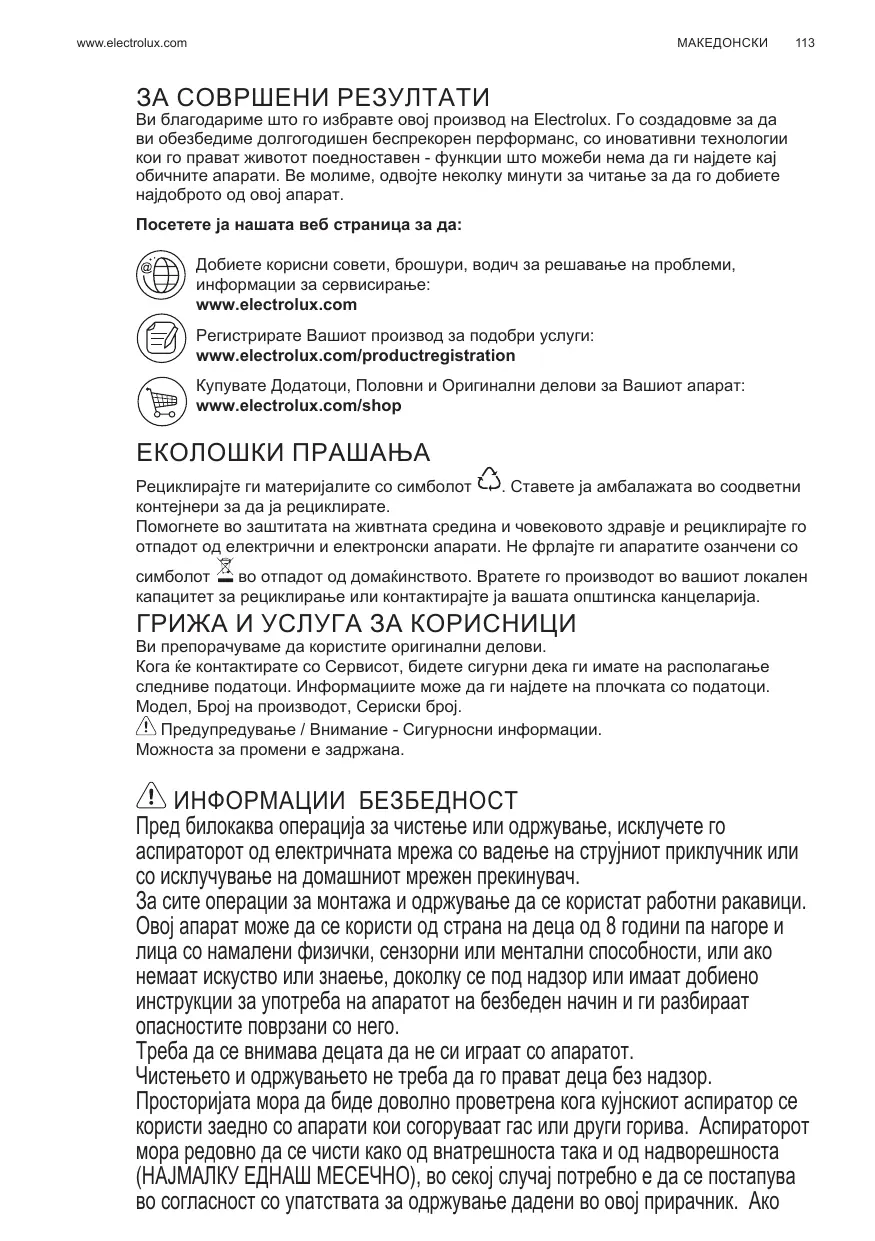 ЗА СОВРШЕНИ РЕЗУЛТАТИ Ви благодариме што го избравте овој производ на Electrolux. Го создадовме за да ви обезбедиме долгогодишен беспрекорен перформанс, со иновативни технологии кои го прават животот поедноставен - функции што можеби нема да ги најдете кај обичните апарати. Ве молиме, одвојте неколку минути за читање за да го добиете најдоброто од овој апарат. Посетете ја нашата веб страница за да: Добиете корисни совети, брошури, водич за решавање на проблеми, информации за сервисирање: www.electrolux.com Регистрирате Вашиот производ за подобри услуги: www.electrolux.com/productregistration Купувате Додатоци, Половни и Оригинални делови за Вашиот апарат: www.electrolux.com/shop ЕКОЛОШКИ ПРАШАЊА Рециклирајте ги материјалите со симболот . Ставете ја амбалажата во соодветни контејнери за да ја рециклирате. Помогнете во заштитата на живтната средина и човековото здравје и рециклирајте го отпадот од електрични и електронски апарати. Не фрлајте ги апаратите озанчени со во отпадот од домаќинството. Вратете го производот во вашиот локален капацитет за рециклирање или контактирајте ја вашата општинска канцеларија. ГРИЖА И УСЛУГА ЗА КОРИСНИЦИ Ви препорачуваме да користите оригинални делови. Кога ќе контактирате со Сервисот, бидете сигурни дека ги имате на располагање следниве податоци. Информациите може да ги најдете на плочката со податоци. Модел, Број на производот, Сериски број. Предупредување / Внимание - Сигурносни информации. Можноста за промени е задржана. ИНФОРМАЦИИ БЕЗБЕДНОСТ Пред билокаква операција за чистење или одржување, исклучете го аспираторот од електричната мрежа со вадење на струјниот приклучник или со исклучување на домашниот мрежен прекинувач. За сите операции за монтажа и одржување да се користат работни ракавици. Овој апарат може да се користи од страна на деца од 8 години па нагоре и лица со намалени физички, сензорни или ментални способности, или ако немаат искуство или знаење, доколку се под надзор или имаат добиено инструкции за употреба на апаратот на безбеден начин и ги разбираат опасностите поврзани со него. Треба да се внимава децата да не си играат со апаратот. Чистењето и одржувањето не треба да го прават деца без надзор. Просторијата мора да биде доволно проветрена кога кујнскиот аспиратор се користи заедно со апарати кои согоруваат гас или други горива. Аспираторот мора редовно да се чисти како од внатрешноста така и од надворешноста (НАЈМАЛКУ ЕДНАШ МЕСЕЧНО), во секој случај потребно е да се постапува во согласност со упатствата за одржување дадени во овој прирачник. Ако