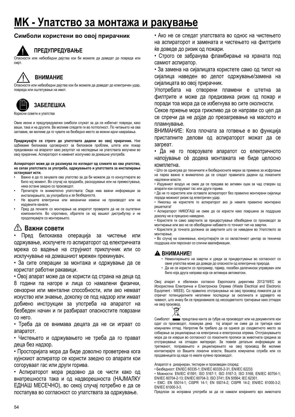 • Les enfants ne doivent pas jouer avec l’appareil. • Le nettoyage et l’entretien par l’usager ne doivent pas être effectués par des enfants sans surveillance. • La pièce doit avoir une aération suffisante lorsque la hotte est utilisée conjointement avec d'autres appareils fonctionnant au gaz ou autres combustibles. • La hotte doit être régulièrement nettoyée à la fois à l'intérieur et à l'extérieur (AU MOINS UNE FOIS PAR MOIS); cela devrait se faire en conformité avec les instructions d'entretien. Le non respect des instructions