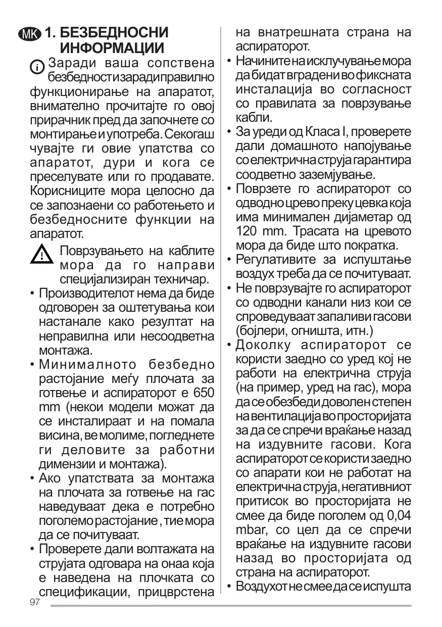 • De ruimte moet voldoende geventileerd zijn als de afzuigkap tegelijk met apparaten op gas of andere brandstoffen wordt gebruikt (niet van toepassing op