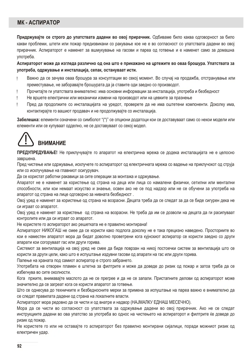 El uso de la llama abierta puede dañar los filtros y causar un incendio, por lo que debe evitarse bajo cualquier circunstancia. Al freír tenga cuidado de que el aceite no se sobrecaliente y se encienda. Las partes accesibles de la campana pueden calentarse durante el funcionamiento del aparato de cocina ubicado debajo de la campana. En cuanto a las medidas técnicas y de seguridad para la evaporación de vapores, es importante seguir estrictamente las reglas determinadas por las autoridades locales. La campana extractora debe limpiarse regularmente tanto desde el interior como desde el exterior (POR LO MENOS UNA VEZ AL MES). Limpie la campana extractora de acuerdo con las instrucciones de mantenimiento de este manual. Si no sigue las instrucciones en este manual con respecto a la limpieza de la campana extractora y de los filtros, puede haber riesgo de incendio.