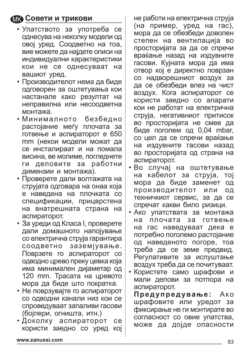 éviter tout risque d’accident. Si les instructions d’installation du plan de cuisson à gaz spécifient une distance supérieure à celle indiquée ci-dessus, veuillez impérativement en tenir compte. Toutes les normes concernant l’évacuation de l’air doivent être respectées. Utiliser exclusivement des vis et des petites pièces du type adapté pour la hotte. Attention: toute installation des vis et des dispositifs de fixation non conforme aux présentes instructions peut entraîner des risques de décharges électriques. Brancher la hotte à l’alimentation de secteur avec un interrupteur bipolaire ayant une ouverture des contacts d’au moins 3 mm. www.zanussi.com