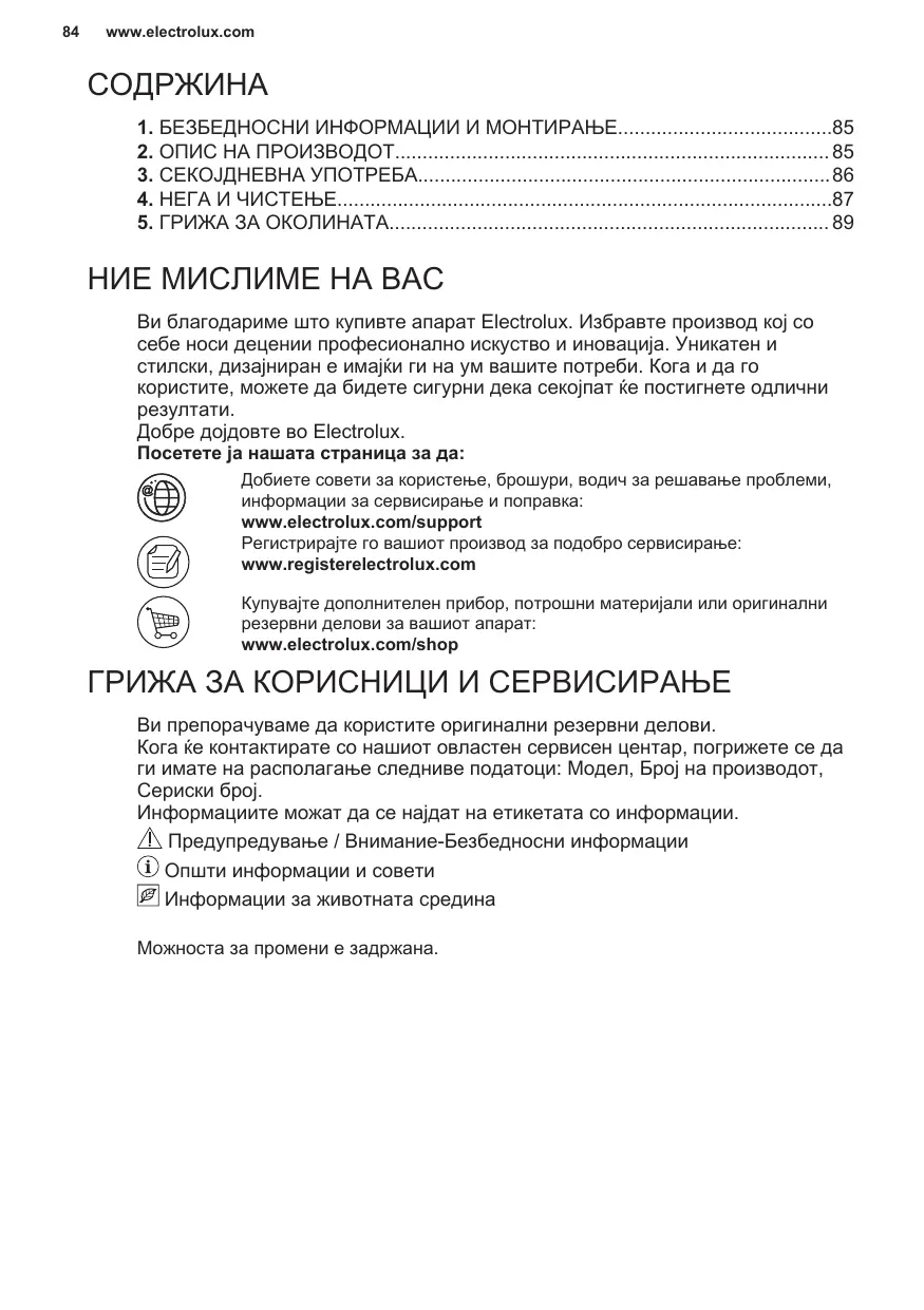 НИЕ МИСЛИМЕ НА ВАС Ви благодариме што купивте апарат Electrolux. Избравте производ кој со себе носи децении професионално искуство и иновација. Уникатен и стилски, дизајниран е имајќи ги на ум вашите потреби. Кога и да го користите, можете да бидете сигурни дека секојпат ќе постигнете одлични Добре дојдовте во Electrolux. Посетете ја нашата страница за да: Добиете совети за користење, брошури, водич за решавање проблеми, информации за сервисирање и поправка: www.electrolux.com/support Регистрирајте го вашиот производ за подобро сервисирање: www.registerelectrolux.com Купувајте дополнителен прибор, потрошни материјали или оригинални резервни делови за вашиот апарат: www.electrolux.com/shop ГРИЖА ЗА КОРИСНИЦИ И СЕРВИСИРАЊЕ Ви препорачуваме да користите оригинални резервни делови. Кога ќе контактирате со нашиот овластен сервисен центар, погрижете се да ги имате на располагање следниве податоци: Модел, Број на производот, Сериски број. Информациите можат да се најдат на етикетата со информации. Предупредување / Внимание-Безбедносни информации Општи информации и совети Информации за животната средина Можноста за промени е задржана.