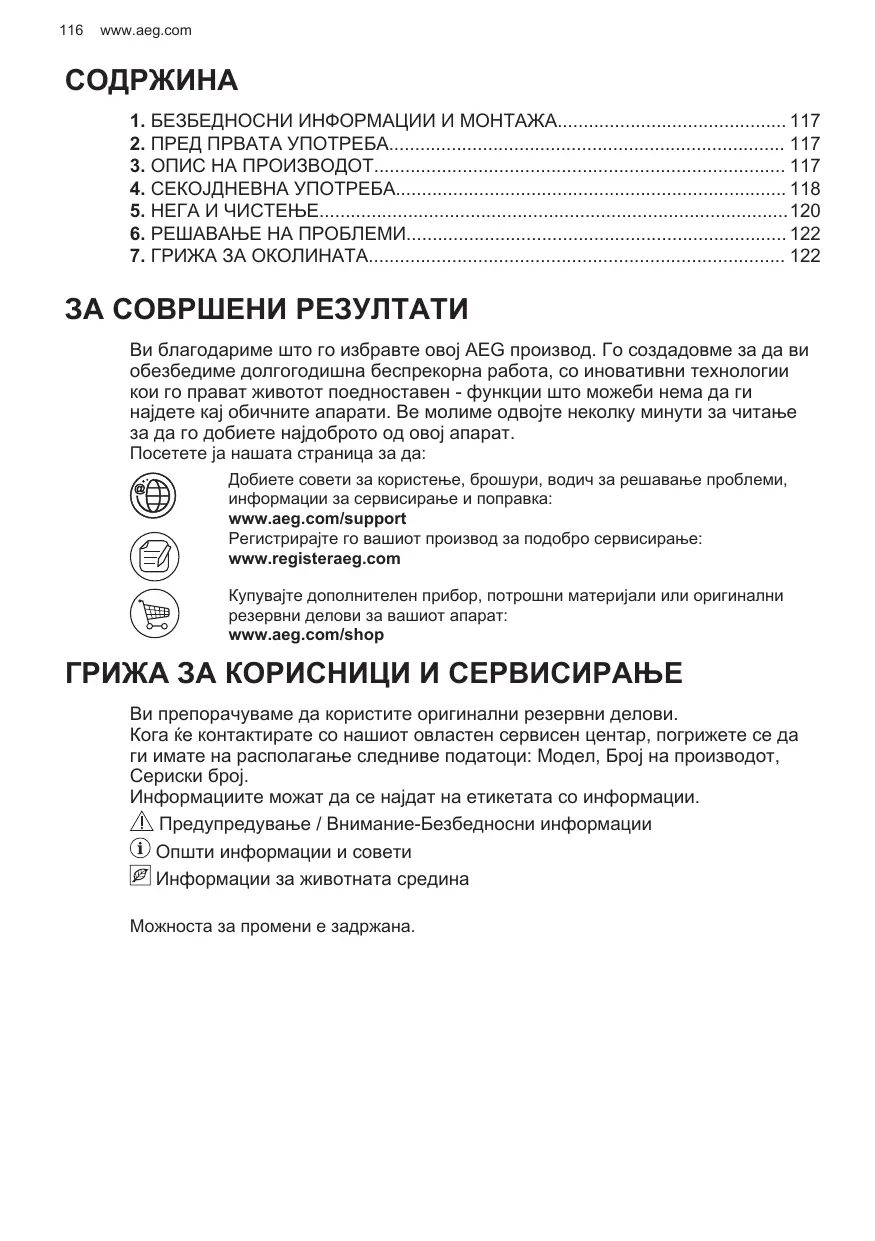 СОДРЖИНА 1. БЕЗБЕДНОСНИ ИНФОРМАЦИИ И МОНТАЖА 117 2. ПРЕД ПРВАТА УПОТРЕБА 117 3. ОПИС НА ПРОИЗВОДОТ 117 4. СЕКОЈДНЕВНА УПОТРЕБА 118 5. НЕГА И ЧИСТЕЊЕ120 6. РЕШАВАЊЕ НА ПРОБЛЕМИ 122 7. ГРИЖА ЗА ОКОЛИНАТА 122