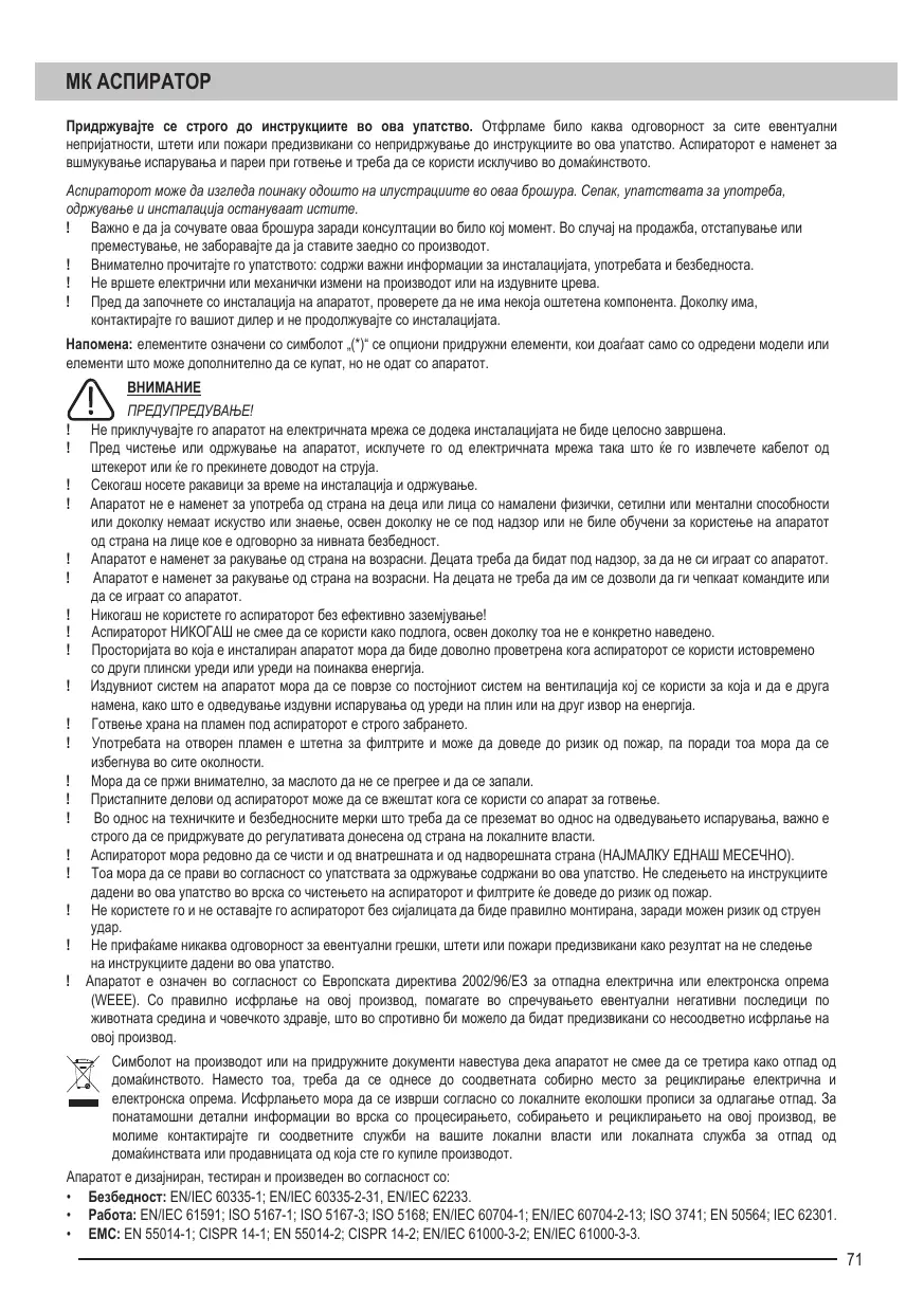 ! Al freír tenga cuidado de que el aceite no se sobrecaliente y se encienda. ! Las partes accesibles de la campana pueden calentarse durante el funcionamiento del aparato de cocina ubicado debajo de la campana. ! En cuanto a las medidas técnicas y de seguridad para la evaporación de vapores, es importante seguir estrictamente las reglas determinadas por las autoridades locales. ! La campana extractora debe limpiarse regularmente tanto desde el interior como desde el exterior (POR LO MENOS UNA VEZ AL MES). ! Limpie la campana extractora de acuerdo con las instrucciones de mantenimiento de este manual. Si no sigue las instrucciones en este manual con respecto a la limpieza de la campana extractora y de los filtros, puede haber riesgo de incendio. ! No utilice la campana extractora o no deje la campana extractora sin la bombilla correctamente instalada, de lo contrario, podría producirse una descarga eléctrica. ! El fabricante se exime de cualquier responsabilidad por defectos, daños o incendios que puedan surgir en el dispositivo debido al incumplimiento de las instrucciones de este manual. ! ! El aparato está marcado de acuerdo con la Directiva Europea 2002/96/CE sobre residuos de equipos eléctricos y electrónicos. Al tener cuidado de eliminar este producto adecuadamente, contribuirá a prevenir los efectos dañinos para el medio ambiente y la salud humana que, de lo contrario, podrían resultar del manejo inadecuado de este producto una vez finalizada su vida útil. El símbolo en el producto o en la documentación adjunta indica que el aparato no debe tratarse como un desecho doméstico, sino que debe entregarse en un punto de recolección adecuado para el reciclaje de equipos eléctricos y electrónicos. Deseche el aparato de acuerdo con las normas ambientales locales para la eliminación de residuos. Para obtener información más detallada sobre la recuperación, recolección y reciclaje de este producto, comuníquese con el departamento correspondiente de la autoridad local competente, el servicio local de gestión de residuos domésticos o la tienda donde adquirió este producto. El aparato está diseñado, probado y fabricado de acuerdo con las siguientes normas o regulaciones: Seguridad: EN/IEC 60335-1; EN/IEC 60335-2-31, EN/IEC 62233. Prestación: EN/IEC 61591; ISO 5167-1; ISO 5167-3; ISO 5168; EN/IEC 60704-1; EN/IEC 60704-2-13; ISO 3741; EN 50564; IEC 62301. En caso de duda, póngase en contacto con un taller de reparación autorizado, un centro de ayuda al cliente u otra persona debidamente cualificada. ¡ADVERTENCIA! Si no instala los tornillos o los accesorios de montaje de acuerdo con estas instrucciones, puede ocurrir un riesgo de descarga eléctrica.