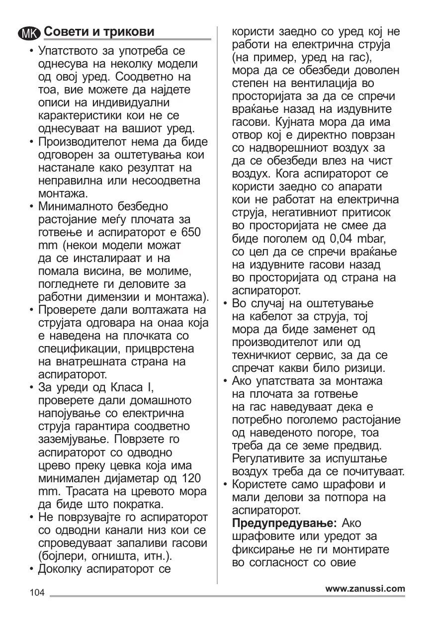 Attention : toute installation des vis et des dispositifs de fixation non conforme aux présentes instructions peut entraîner des risques de décharges électriques. • Brancher la hotte à l’alimentation de secteur avec un interrupteur bipolaire ayant une ouverture des contacts d’au moins 3 mm.