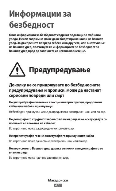 Информации за Овие информации за безбедност содржат податоци за мобилни уреди. Некои содржини може да не бидат применливи на Вашиот уред. За да спречите повреда себеси и на другите, или оштетување на Вашиот уред, прочитајте ги информациите за безбедност за Вашиот уред пред да започнете со негово користење. Предупредување Доколку не се придржувате до безбедносните предупредувања и прописи, може да настанат сериозни повреди или смрт Не употребувајте оштетени електрични приклучоци, продолжни кабли или лабави приклучоци Небезбеден приклучок може да предизвика електричен шок или пожар. Не допирајте го струјниот кабел со влажни раце и не исклучувајте го полначот со влечење на кабелот Во спротивно може да дојде до електричен удар. Не превиткувајте го и не оштетувајте го приклучниот кабел Во спротивно може да настане електричен шок или пожар. Не користете го Вашиот уред додека се полни и не допирајте го со влажни раце Во спротивно може настане електричен шок.