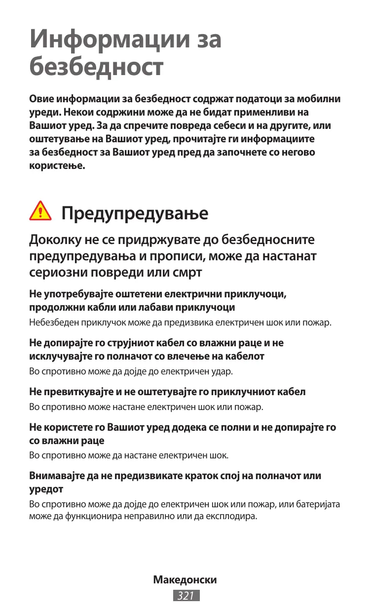 Не расклопувајте, менувајте и не поправајте го Вашиот уред • Какви било промени или изменувања може ја поништат гаранцијата на производителот. Ако Вашиот уред треба да се сервисира, однесете го во Сервисниот центар на Samsung. • Не расклопувајте и не дупчете ја батеријата затоа што тоа може да предизвика експлозија или пожар. • Исклучете го уредот пред да ја извадите батеријата. Ако ја извадите батеријата додека уредот е вклучен, може да дојде до неправилно функционирање на уредот.