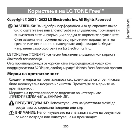 Le LG TONE Free (TONE-FP5) est une paire d'oreillettes sans fil légère qui utilise la technologie Bluetooth. Ce produit peut être utilisé comme accessoire audio avec les appareils prenant en charge les profils Bluetooth A2DP ou Mains libres.