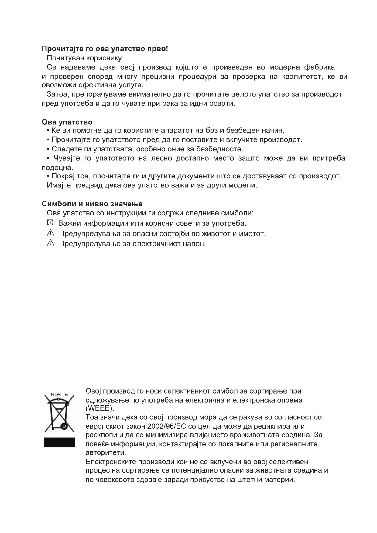 • Прочитајте го упатството пред да го поставите и вклучите производот.