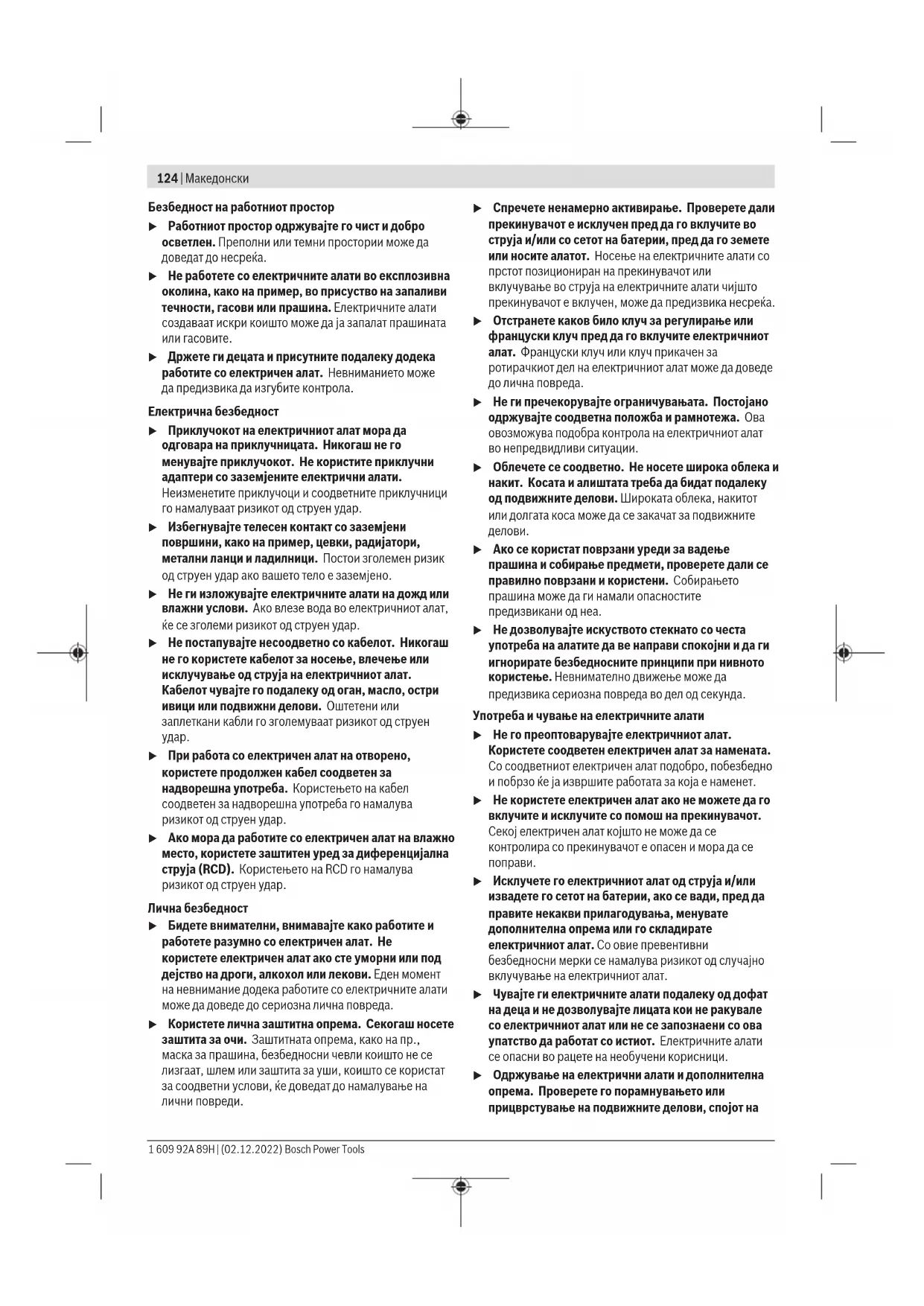 Прочитајте ги сите безбедносни предупредувања, илустрации и спецификации приложени со овој електричен алат. Непридржувањето до сите упатства приложени подолу може да доведе до струен удар, пожар и/или тешки повреди. Зачувајте ги безбедносните предупредувања и упатства за користење и за во иднина. Поимот „електричен алат“ во безбедносните предупредувања се однесува на електрични апарати што користат струја (кабелски) или апарати што користат батерии (акумулаторски). Bosch Power Tools 1 609 92A 89H | (02.12.2022)124 | Македонски Безбедност на работниот простор u Работниот простор одржувајте го чист и добро осветлен. Преполни или темни простории може да доведат до несреќа. u Не работете со електричните алати во експлозивна околина, како на пример, во присуство на запаливи течности, гасови или прашина. Електричните алати создаваат искри коишто може да ја запалат прашината или гасовите. u Држете ги децата и присутните подалеку додека работите со електричен алат. Невниманието може да предизвика да изгубите контрола. Електрична безбедност u Приклучокот на електричниот алат мора да одговара на приклучницата. Никогаш не го менувајте приклучокот. Не користите приклучни адаптери со заземјените електрични алати. Неизменетите приклучоци и соодветните приклучници го намалуваат ризикот од струен удар. u Избегнувајте телесен контакт со заземјени површини, како на пример, цевки, радијатори, метални ланци и ладилници. Постои зголемен ризик од струен удар ако вашето тело е заземјено. u Не ги изложувајте електричните алати на дожд или влажни услови. Ако влезе вода во електричниот алат, ќе се зголеми ризикот од струен удар. u Не постапувајте несоодветно со кабелот. Никогаш не го користете кабелот за носење, влечење или исклучување од струја на електричниот алат. Кабелот чувајте го подалеку од оган, масло, остри ивици или подвижни делови. Оштетени или заплеткани кабли го зголемуваат ризикот од струен