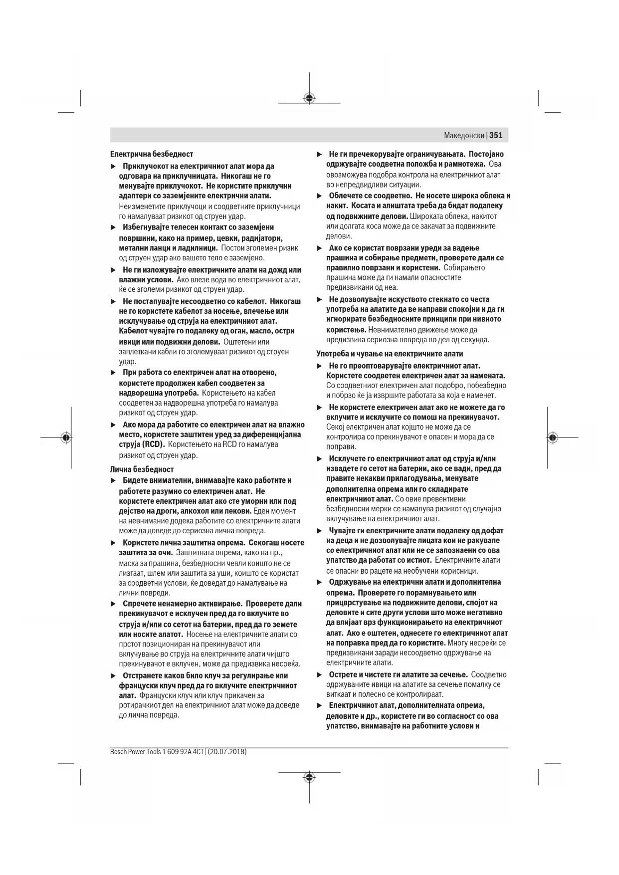 употребата Сервизът ще отговори на въпросите Ви относно ремонтии поддръжка на закупения от Вас продукт, както и относ-но резервни части. Покомпонентни чертежи и информа-ция за резервните части ще откриете и на: www.bosch-pt.comЕкипът по консултация относно употребата на Bosch щеВи помогне с удоволствие при въпроси за нашите про-дукти и техните аксесоари.Моля, при въпроси и при поръчване на резервни частивинаги посочвайте 10-цифрения каталожен номер, изпи-сан на табелката на уреда.БългарияRobert Bosch SRL Service scule electrice Strada Horia Măcelariu Nr. 30–34, sector 1 013937 Bucureşti, România Тел.: +359(0)700 13 667 (Български) Факс: +40 212 331 313 Email: BoschServiceCenterBG@ro.bosch.com www.bosch-pt.com/bg/bg/ Бракуване С оглед опазване на околната среда електроинструмен-тът, допълнителните приспособления и опаковката тряб-ва да бъдат подложени на подходяща преработка за пов-торното използване на съдържащите се в тях суровини.Не изхвърляйте електроинструменти при би-товите отпадъци!Само за страни отЕС:Съгласно европейска директива 2012/19/EС и хармони-зирането на националното законодателство с нея елект-ронни и електрически уреди, които не могат да се използ-ват, трябва да бъдат събирани отделно и да бъдат преда-вани за оползотворяване на съдържащите се в тях суро-вини. Македонски