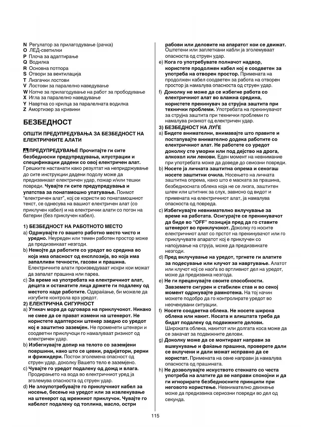 d) Пред вклучување на уредот, тргнете ги алатите за подесување или клучот за навртување. Алатот или клучот кој се наоѓа во вртливиот дел на уредот, може да предизвика незгода. e) Не ги преценувајте своите способности. Завземете сигурен и стабилен став и во секој момент одржувајте рамнотежа. На тој начин можете подобро да го контролирате уредот во неочекувани ситуации. f) Носете соодветна облека. Не носете широка облека или накит. Косата и алиштата треба да бидат подалеку од подвижните делови. Широката облека, накитот или долгата коса може да се закачат за подвижните делови. g) Доколку може да се монтираат направи за вшмукување и фаќање прашина, проверете дали се вклучени и дали можат исправно да се користат. Примената на овие направи ја намалува опасноста од прашината. h) Не дозволувајте искуството стекнато со честа употреба на алатите да ве направи спокојни и да ги игнорирате безбедносните принципи при неговото користење. Невнимателно движење може да предизвика сериозни повреди во дел од секунда.116