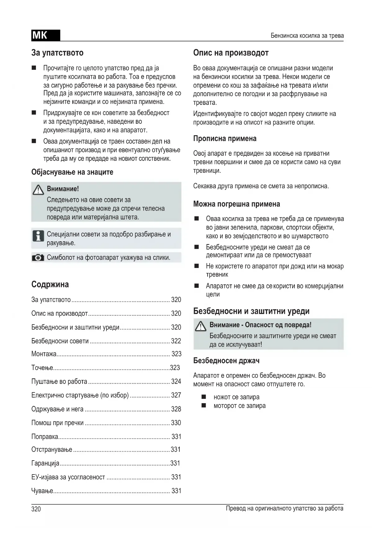 за сечење извлечете го штекерот од свеќичката. Пред пуштање во работа прочитајте го упатството за користење! Погрижете се да нема никого во опасните подрачја! Држете ги рацете и стапалата подалеку од погонот за сечење! Држете се на растојание од опасните подрачја.