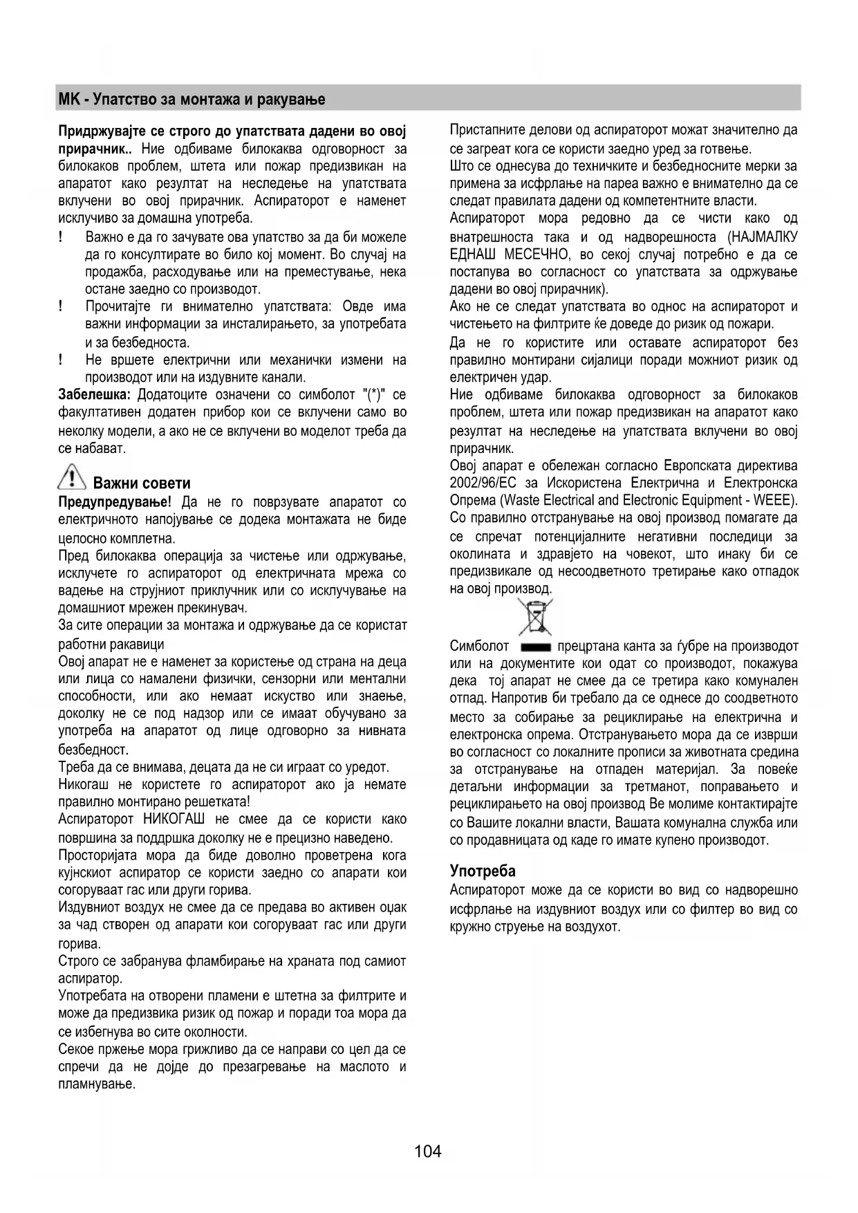 MK - Упатство за монтажа и ракување