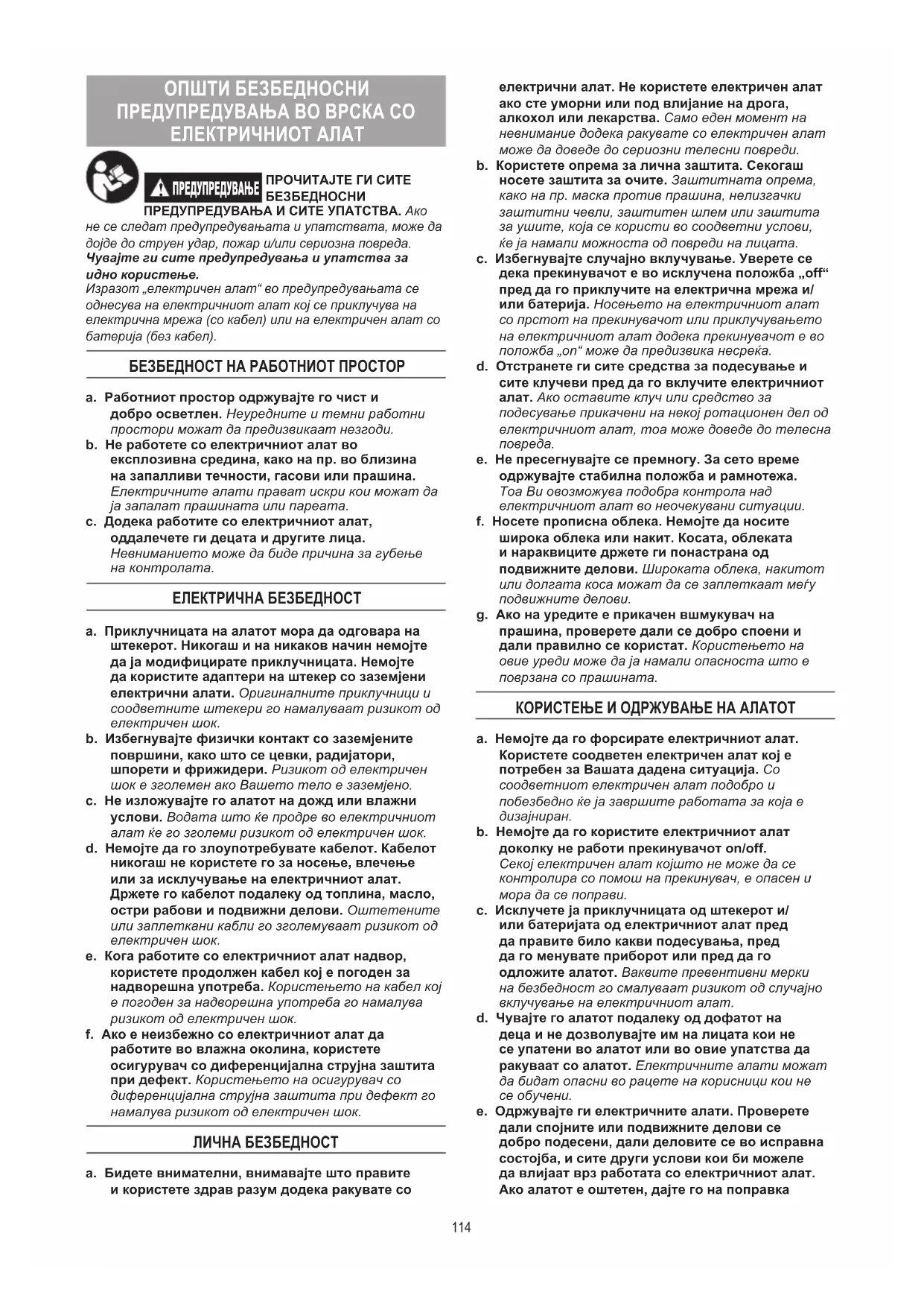 Изразот „електричен алат“ во предупредувањата се однесува на електричниот алат кој се приклучува на електрична мрежа (со кабел) или на електричен алат со батерија (без кабел). БЕЗБЕДНОСТ НА РАБОТНИОТ ПРОСТОР a. Работниот простор одржувајте го чист и добро осветлен. Неуредните и темни работни простори можат да предизвикаат незгоди.b. Не работете со електричниот алат во експлозивна средина, како на пр. во близина на запалливи течности, гасови или прашина. Електричните алати прават искри кои можат да ја запалат прашината или пареата.c. Додека работите со електричниот алат, оддалечете ги децата и другите лица. Невниманието може да биде причина за губење на контролата. ЕЛЕКТРИЧНА БЕЗБЕДНОСТ a. Приклучницата на алатот мора да одговара на штекерот. Никогаш и на никаков начин немојте да ја модифицирате приклучницата. Немојте да користите адаптери на штекер со заземjени електрични алати. Оригиналните приклучници и соодветните штекери го намалуваат ризикот од електричен шок.b. Избегнувајте физички контакт со заземјените површини, како што се цевки, радијатори, шпорети и фрижидери. Ризикот од електричен шок е зголемен ако Вашето тело е заземјено.c. Не изложувајте го алатот на дожд или влажни услови. Водата што ќе продре во електричниот алат ќе го зголеми ризикот од електричен шок.d. Немојте да го злоупотребувате кабелот. Кабелот никогаш не користете го за носење, влечење или за исклучување на електричниот алат. Држете го кабелот подалеку од топлина, масло, остри рабови и подвижни делови. Оштетените или заплеткани кабли го зголемуваат ризикот од електричен шок.e. Кога работите со електричниот алат надвор, користете продолжен кабел кој е погоден за надворешна употреба. Користењето на кабел кој е погоден за надворешна употреба го намалува ризикот од електричен шок.f. Ако е неизбежно со електричниот алат да работите во влажна околина, користете осигурувач со диференцијална струјна заштита при дефект. Користењето на осигурувач со диференцијална струјна заштита при дефект го намалува ризикот од електричен шок. ЛИЧНА БЕЗБЕДНОСТ a. Бидете внимателни, внимавајте што правите и користете здрав разум додека ракувате со електрични алат. Не користете електричен алат ако сте уморни или под влијание на дрога, алкохол или лекарства. Само еден момент на невнимание додека ракувате со електричен алат може да доведе до сериозни телесни повреди.b. Користете опрема за лична заштита. Секогаш носете заштита за очите. Заштитната опрема, како на пр. маска против прашина, нелизгачки заштитни чевли, заштитен шлем или заштита за ушите, која се користи во соодветни услови, ќе ја намали можноста од повреди на лицата.c. Избегнувајте случајно вклучување. Уверете се дека прекинувачот е во исклучена положба „off“ пред да го приклучите на електрична мрежа и/или батерија. Носењето на електричниот алат со прстот на прекинувачот или приклучувањето на електричниот алат додека прекинувачот е во положба „on“ може да предизвика несреќа.d. Отстранете ги сите средства за подесување и сите клучеви пред да го вклучите електричниот алат. Ако оставите клуч или средство за подесување прикачени на некој ротационен дел од електричниот алат, тоа може доведе до телесна повреда.e. Не пресегнувајте се премногу. За сето време одржувајте стабилна положба и рамнотежа. Тоа Ви овозможува подобра к
