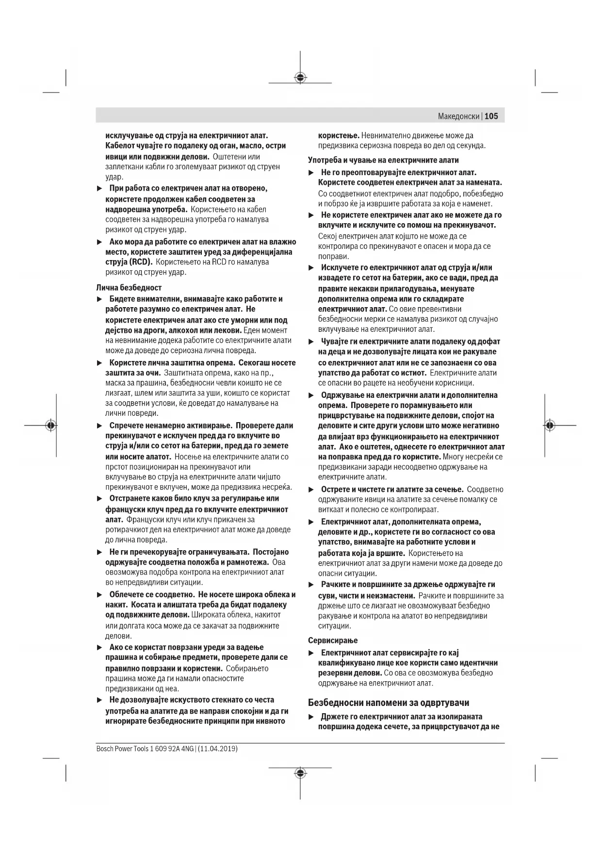 ќе се зголеми ризикот од струен удар. u Не постапувајте несоодветно со кабелот. Никогаш не го користете кабелот за носење, влечење или 1 609 92A 4NG | (11.04.2019) Bosch Power ToolsМакедонски | 105