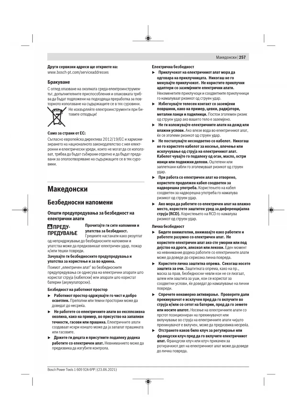 1,5 Нивото на вибрации наведенo во овие упатства е измеренo со нормирана постапка за мерење и може да се користи за меѓусебна споредба на електрични алати. Исто така може да се прилагоди за предвремена процена на оптоварувањето со вибрации. Наведеното ниво на вибрации е за главната примена на електричниот алат. Доколку електричниот алат се користи за други примени, алатот што се вметнува отстапува од нормите или недоволно се одржува, може да отстапува нивото на вибрации. Ова може значително да го зголеми оптоварувањето со вибрации во периодот на целокупното работење. За прецизно одредување на оптоварувањето со вибрации, треба да се земе предвид и периодот во кој уредот е исклучен или едвај работи, а не во моментот кога е во употреба. Ова може значително да го намали оптоварувањето со вибрации во периодот на целокупното работење. Утврдете ги дополнителните мерки за безбедност за заштита на корисникот од влијанието на вибрациите, како на пр.: одржувајте ги внимателно електричните алати и алатите за вметнување, одржувајте ја топлината на дланките, организирајте го текот на работата. Bosch Power Tools 1 609 92A 6PP | (23.06.2021)264 | Македонски