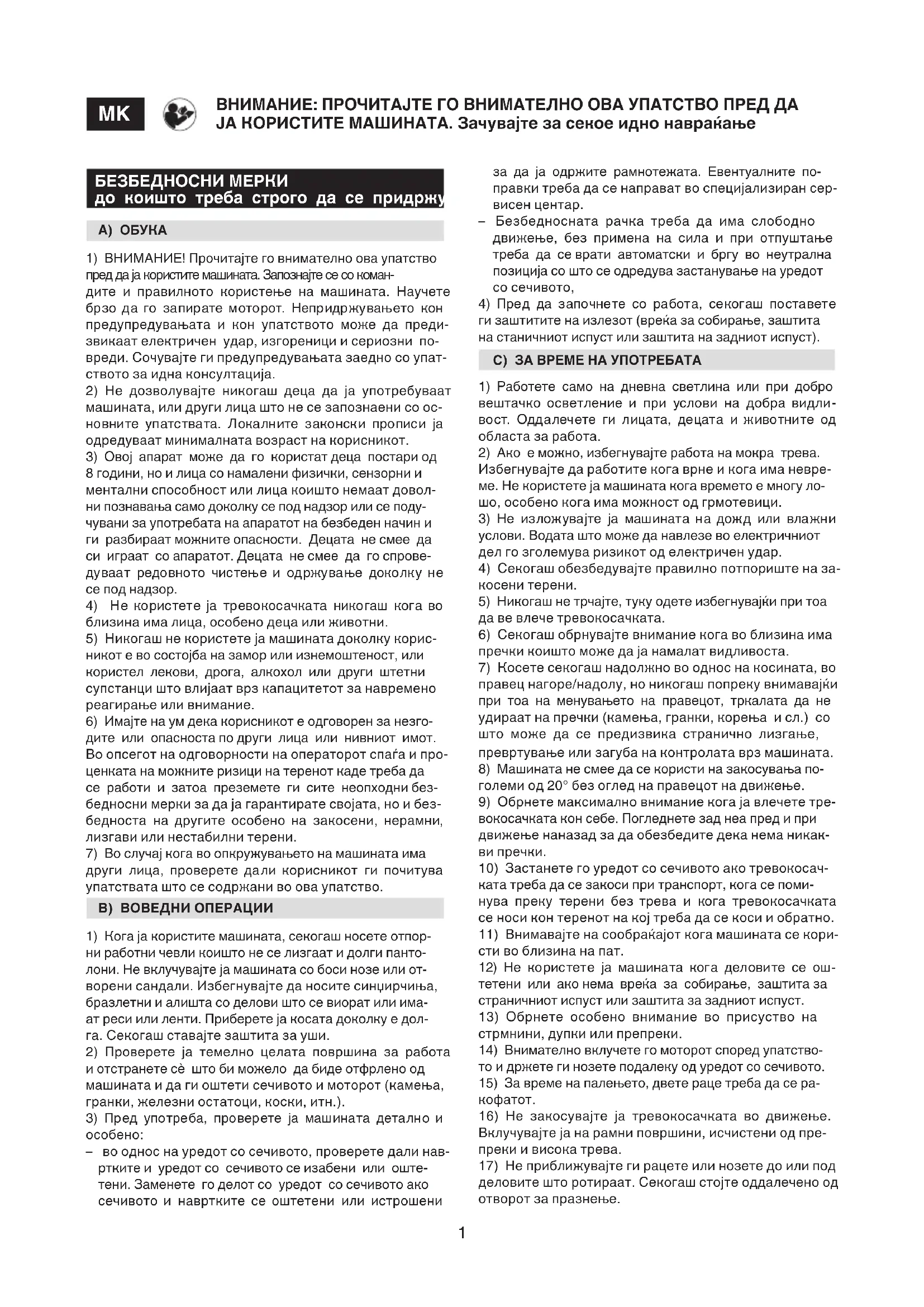 ВНИМАНИЕ: ПРОЧИТАЈТЕ ГО ВНИМАТЕЛНО ОВА УПАТСТВО ПРЕД ДА ЈА КОРИСТИТЕ МАШИНАТА. Зачувајте за секое идно навраќање за да ја одржите рамнотежата. Евентуалните по- правки треба да се направат во специјализиран сер- висен центар. – Безбедносната рачка треба да има слободно движење, без примена на сила и при отпуштање треба да се врати автоматски и бргу во неутрална позиција со што се одредува застанување на уредот со сечивото,