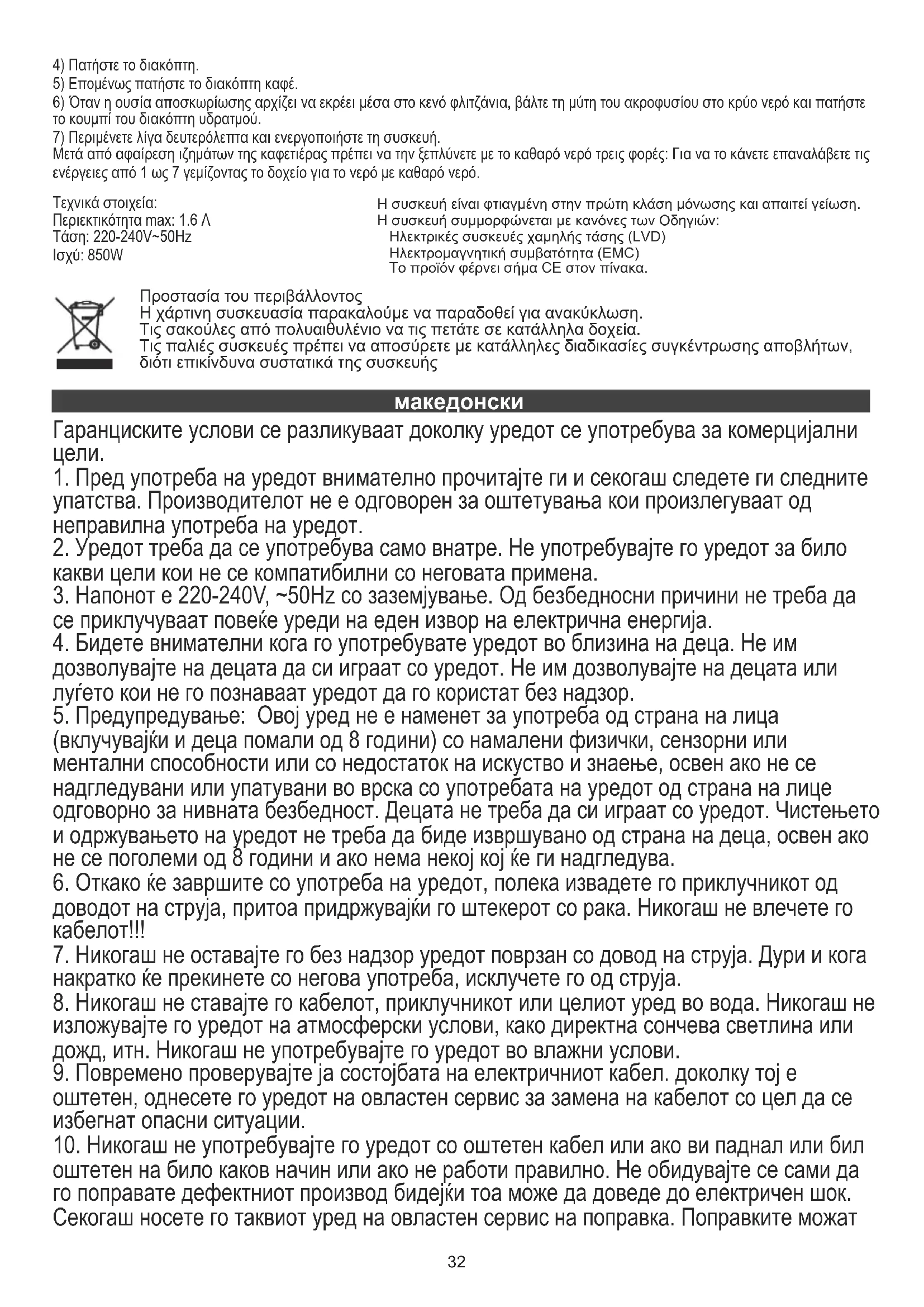 Откако ќе се изврши чистењето на камен машина треба да се измие со чиста вода три пати: за да го направите ова, повторете ги дејностите од 1 до 7, пополнувајќи го резервоарот са вода со чиста вода. Технички податоци Максимален капацитет: 1.6л Напон: 220-240V~50Hz Јачина: 850W Уредот е направен во I класа на изолација. Уред е во согласност со директивите на ЕУ: - Директива за низок напон (LVD) - Електромагнетна компатибилност (EMC) Уред означени CE ознака на етикетата За да се заштитат вашата околина: ве молиме одделни кутии и пластични кеси и да располага со нив во соодветните канти за отпадоци. Користи апаратот треба да биде предаден на посветен собирање поени поради hazarsous компоненти, кои можат да влијаат на животната средина. Не фрлајте овој апарат во заедничката корпа за отпадоци. По секоја употреба, темелно исчистете ја млазницата за пенење на млекото. Избришете го со влажна крпа и оставете го на пареа 10 секунди.35 OPŠTI USLOVI BEZBJEDNOSTI. VAŽNE UPUTE KOJE SE TIČU BEZBJEDNOSTI UPOTREBE. PROČITAJTE IH PAŽLJIVO I SAČUTOVAJTE KAKO BISTE IH KONSULTOVALI U BUDUĆNOSTI 1.Prije početka eksploatacije aparata treba pročitati uputstvo za upotrebu i postupati prema njegovim uputama. Proizvođač ne snosi odgovornost za štete koje su nastale uslijed nenamjenske upotrebe ili neodgovarajućeg rukovanja.