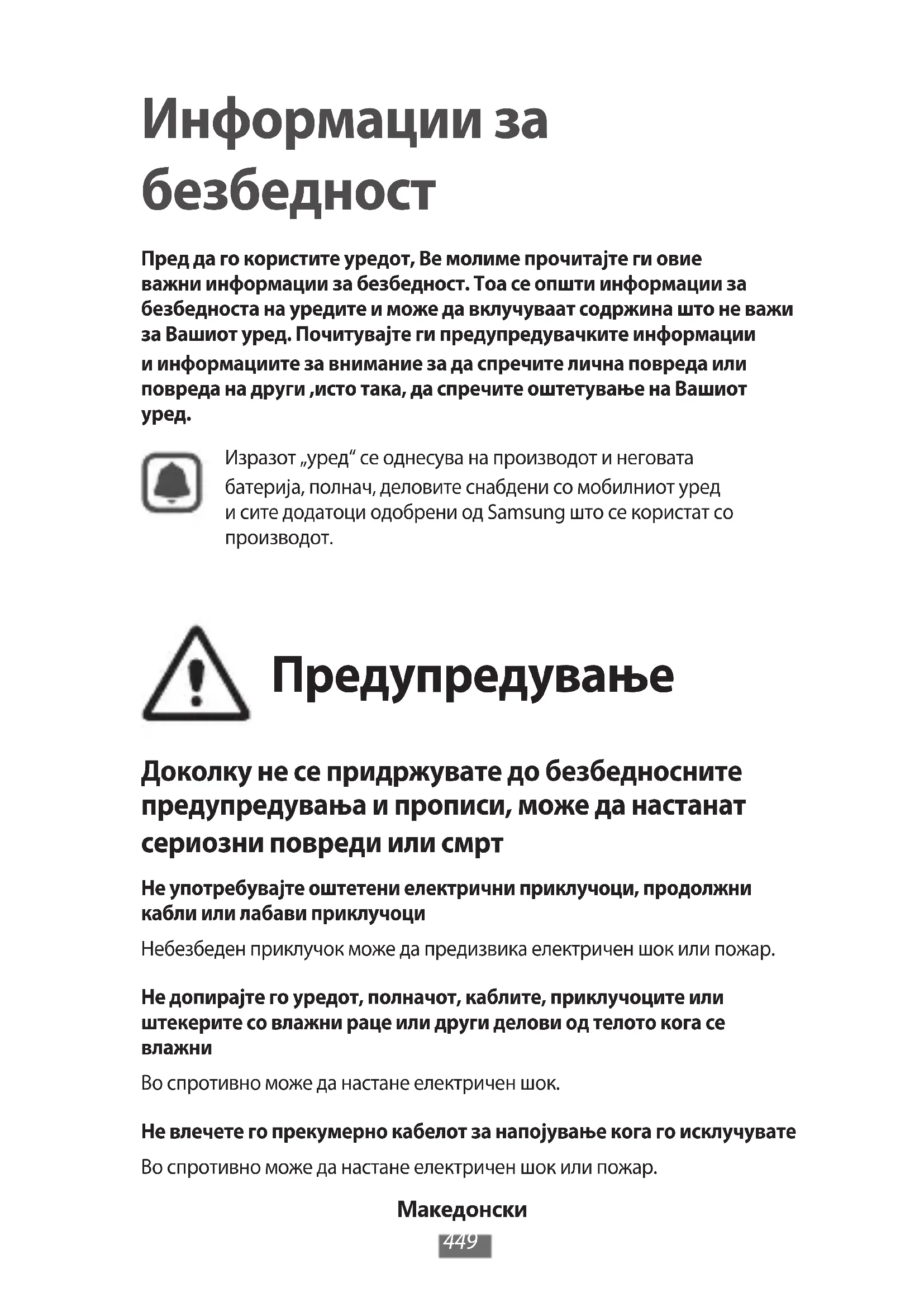 Пред да го користите уредот, Ве молиме прочитајте ги овие важни информации за безбедност. Тоа се општи информации за безбедноста на уредите и може да вклучуваат содржина што не важи за Вашиот уред. Почитувајте ги предупредувачките информации и информациите за внимание за да спречите лична повреда или повреда на други ,исто така, да спречите оштетување на Вашиот уред.Изразот „уред“ се однесува на производот и неговата батерија, полнач, деловите снабдени со мобилниот уред и сите додатоци одобрени од Samsung што се користат со производот. Предупредување Доколку не се придржувате до безбедносните предупредувања и прописи, може да настанат сериозни повреди или смрт Не употребувајте оштетени електрични приклучоци, продолжни кабли или лабави приклучоциНебезбеден приклучок може да предизвика електричен шок или пожар.Не допирајте го уредот, полначот, каблите, приклучоците или штекерите со влажни раце или други делови од телото кога се влажниВо спротивно може да настане електричен шок.Не влечете го прекумерно кабелот за напојување кога го исклучуватеВо спротивно може да настане електричен шок или пожар.Македонски