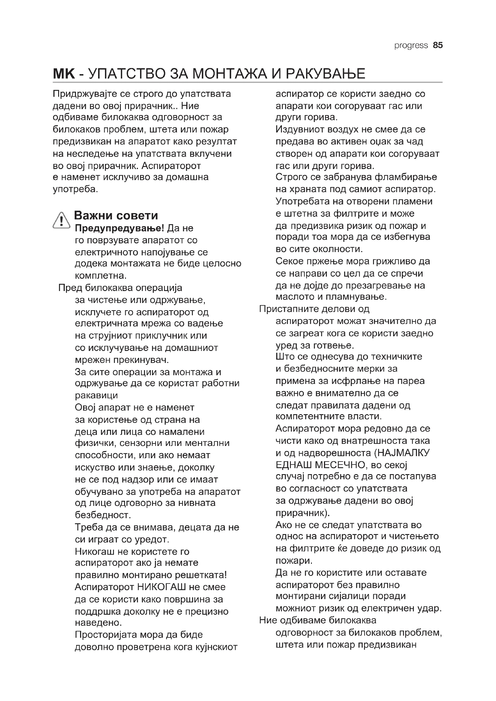 Да не го користите или оставате аспираторот без правилно монтирани сијалици поради можниот ризик од електричен удар. Ние одбиваме билокаква одговорност за билокаков проблем, штета или пожар предизвикан86 progress на апаратот како резултат на неследење на упатствата вклучени во овој прирачник. Овој апарат е обележан согласно Европската директива 2002/96/ EC за Искористена Електрична и Електронска Опрема (Waste Electrical and Electronic Equipment - WEEE). Со правилно отстранување на овој производ помагате да се спречат потенцијалните негативни последици за околината и здравјето на човекот, што инаку би се предизвикале од несоодветното третирање како отпадок на овој