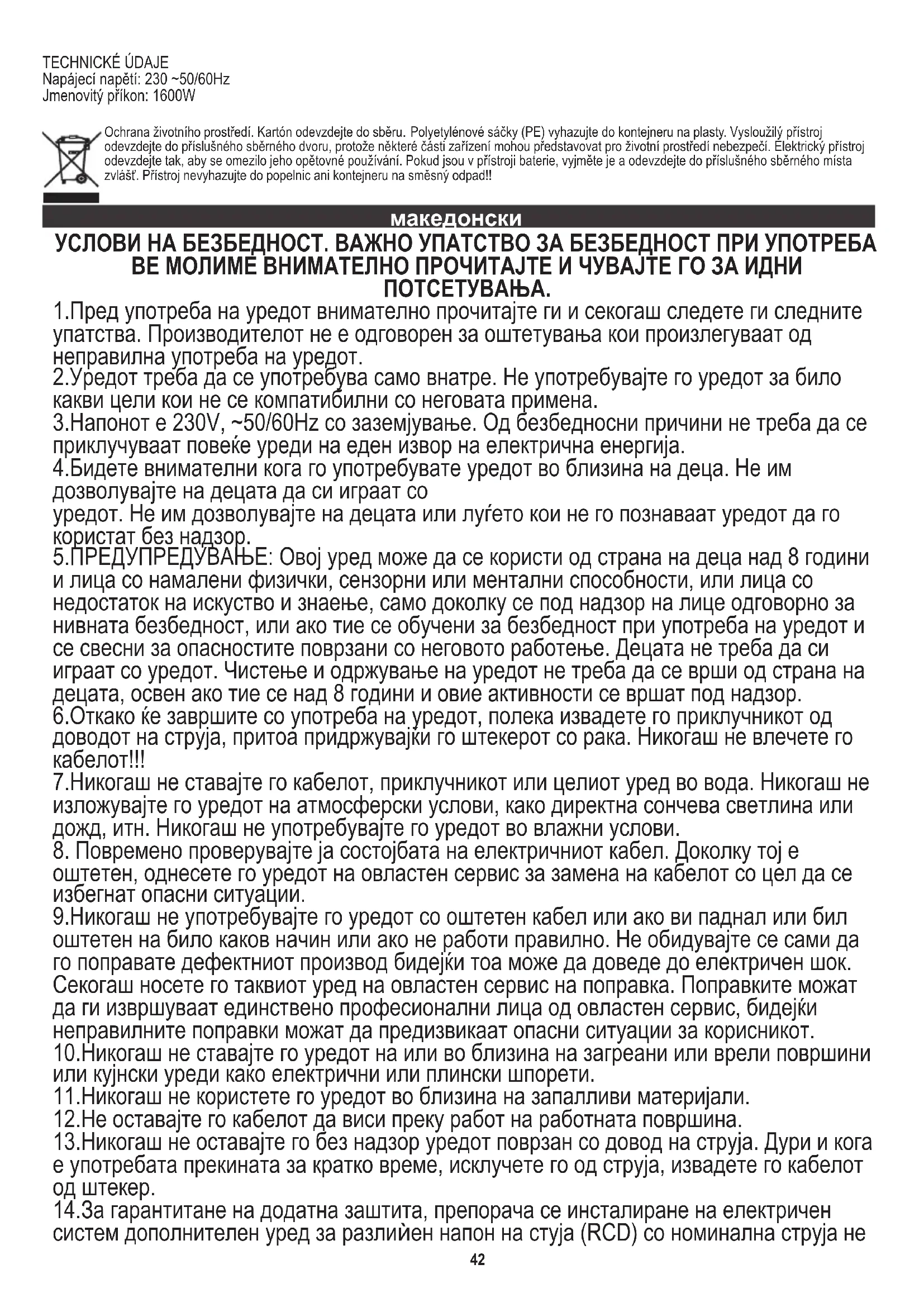 2.Уредот треба да се употребува само внатре. Не употребувајте го уредот за било какви цели кои не се компатибилни со неговата примена. 10.Никогаш не ставајте го уредот на или во близина на загреани или врели површини или кујнски уреди како електрични или плински шпорети. 3.Напонот е 230V, ~50/60Hz со заземјување. Од безбедносни причини не треба да се приклучуваат повеќе уреди на еден извор на електрична енергија. 7.Никогаш не ставајте го кабелот, приклучникот или целиот уред во вода. Никогаш не изложувајте го уредот на атмосферски услови, како директна сончева светлина или дожд, итн. Никогаш не употребувајте го уредот во влажни услови. 9.Никогаш не употребувајте го уредот со оштетен кабел или ако ви паднал или бил оштетен на било каков начин или ако не работи правилно. Не обидувајте се сами да го поправате дефектниот производ бидејќи тоа може да доведе до електричен шок. Секогаш носете го таквиот уред на овластен сервис на поправка. Поправките можат да ги извршуваат единствено професионални лица од овластен сервис, бидејќи неправилните поправки можат да предизвикаат опасни ситуации за корисникот. 14.За гарантитане на додатна заштита, препорача се инсталиране на електричен систем дополнителен уред за разлиѝен напон на стуја (RCD) со номинална струја не 4.Бидете внимателни кога го употребувате уредот во близина на деца. Не им дозволувајте на децата да си играат со