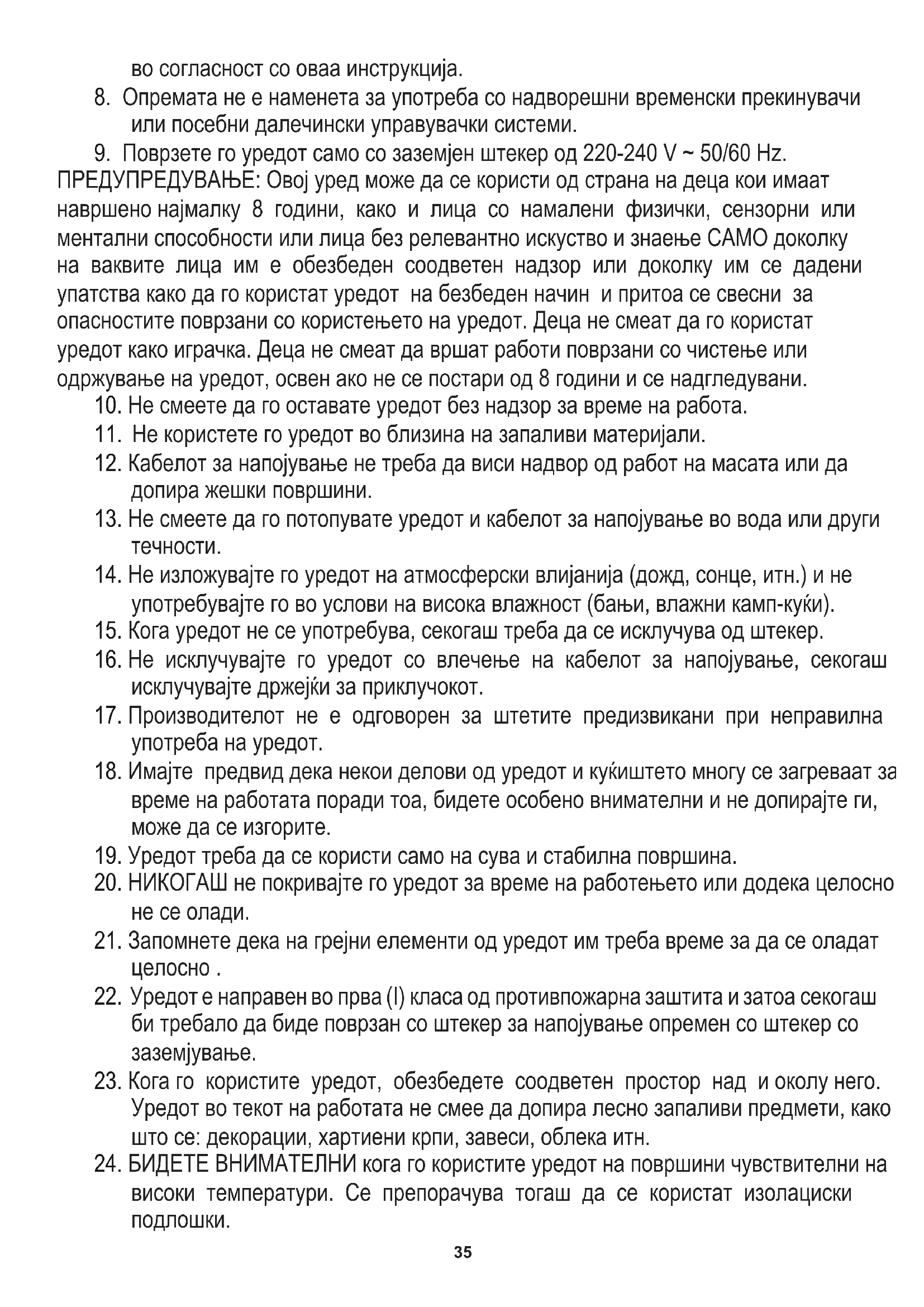 Уредот во текот на работата не смее да допира лесно запаливи предмети, како што се: декорации, хартиени крпи, завеси, облека итн. ПРЕДУПРЕДУВАЊЕ: Овој уред може да се користи од страна на деца кои имаат навршено најмалку 8 години, како и лица со намалени физички, сензорни или ментални способности или лица без релевантно искуство и знаење САМО доколку на ваквите лица им е обезбеден соодветен надзор или доколку им се дадени упатства како да го користат уредот на безбеден начин и притоа се свесни за опасностите поврзани со користењето на уредот. Деца не смеат да го користат уредот како играчка. Деца не смеат да вршат работи поврзани со чистење или одржување на уредот, освен ако не се постари од 8 години и се надгледувани.