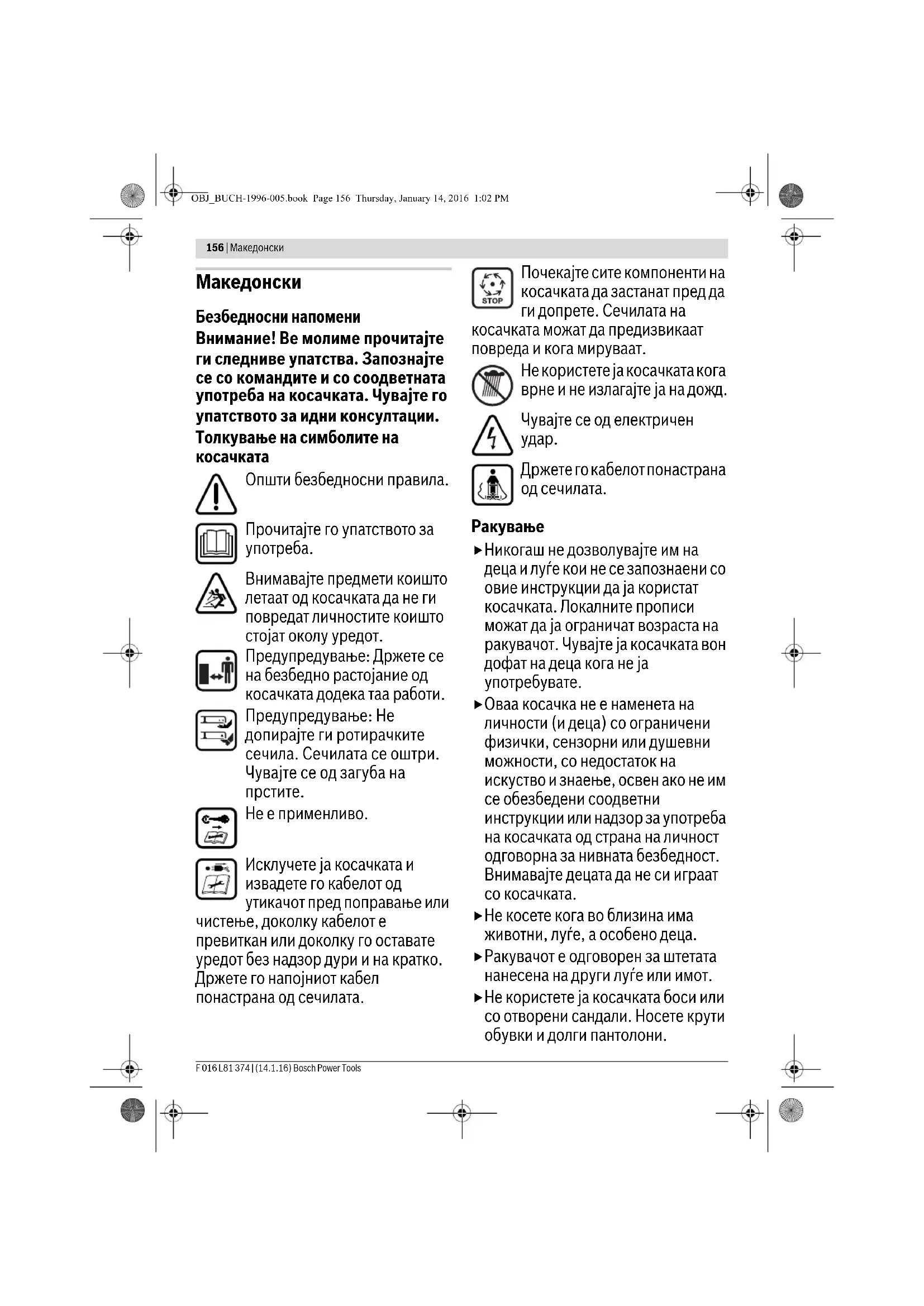 Никогаш не дозволувајте им на деца и луѓе кои не се запознаени со овие инструкции да ја користат косачката. Локалните прописи можат да ја ограничат возраста на ракувачот. Чувајте ја косачката вон дофат на деца кога не ја употребувате. Оваа косачка не е наменета на личности (и деца) со ограничени физички, сензорни или душевни можности, со недостаток на искуство и знаење, освен ако не им се обезбедени соодветни инструкции или надзор за употреба на косачката од страна на личност одговорна за нивната безбедност. Внимавајте децата да не си играат со косачката. Не косете кога во близина има животни, луѓе, а особено деца. Ракувачот е одговорен за штетата нанесена на други луѓе или имот. Не користете ја косачката боси или со отворени сандали. Носете крути обувки и долги пантолони. OBJ_BUCH-1996-005.book Page 156 Thursday, January 14, 2016 1:02 PMМакедонски | 157 Bosch Power Tools F 016 L81 374 | (14.1.16) Детално прегледајте го теренот каде што ќе ја користите косачката и отстранете ги сите камења, стапови, жици, коски и други предмети. Секогаш пред употреба проверете да не се оштетени или истрошени сечилата, носачите на сечилата или склопката за сечење. Заменете ги истрошените или оштетените сечила и носачи за да ја одржите рамнотежата на косалката. Косете само по дневна светлина или под добро осветлување. Избегнувајте косење при лоши временски услови, на пример кога постои ризик од грмотевици. По можност, не употребувајте ја косачката на влажна трева. Одете полека, не трчајте. Не користете ја косачката со оштетени штитници или браници, или без заштитна опрема, на пример соодветен штит или контејнер за трева. Носете заштита за слухот. Употребата на косачката на коси површини може да биде опасно. – Не косете на премногу стрмни