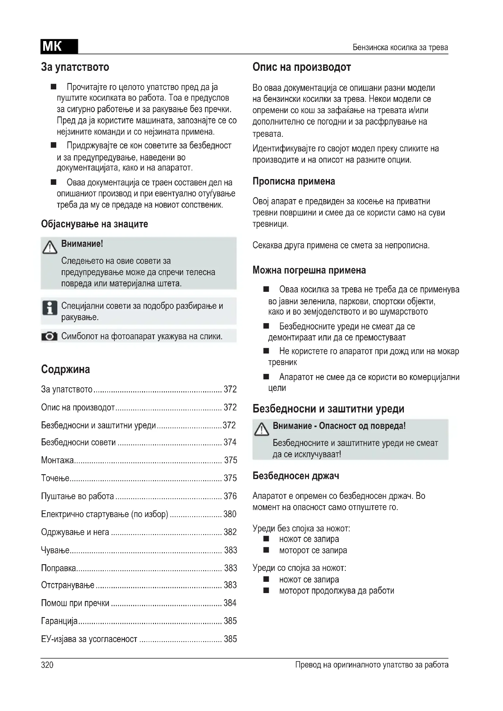 Внимание - Опасност од повреда! Безбедноснитеизаштитнитеурединесмеат дасеисклучуваат! Внимание - Опасност од пожар! Нечувајтенамашинатасополнрезервоар вообјекти,вокоииспарувањатаодбензинот можатдадојдатводопирсооганилисо