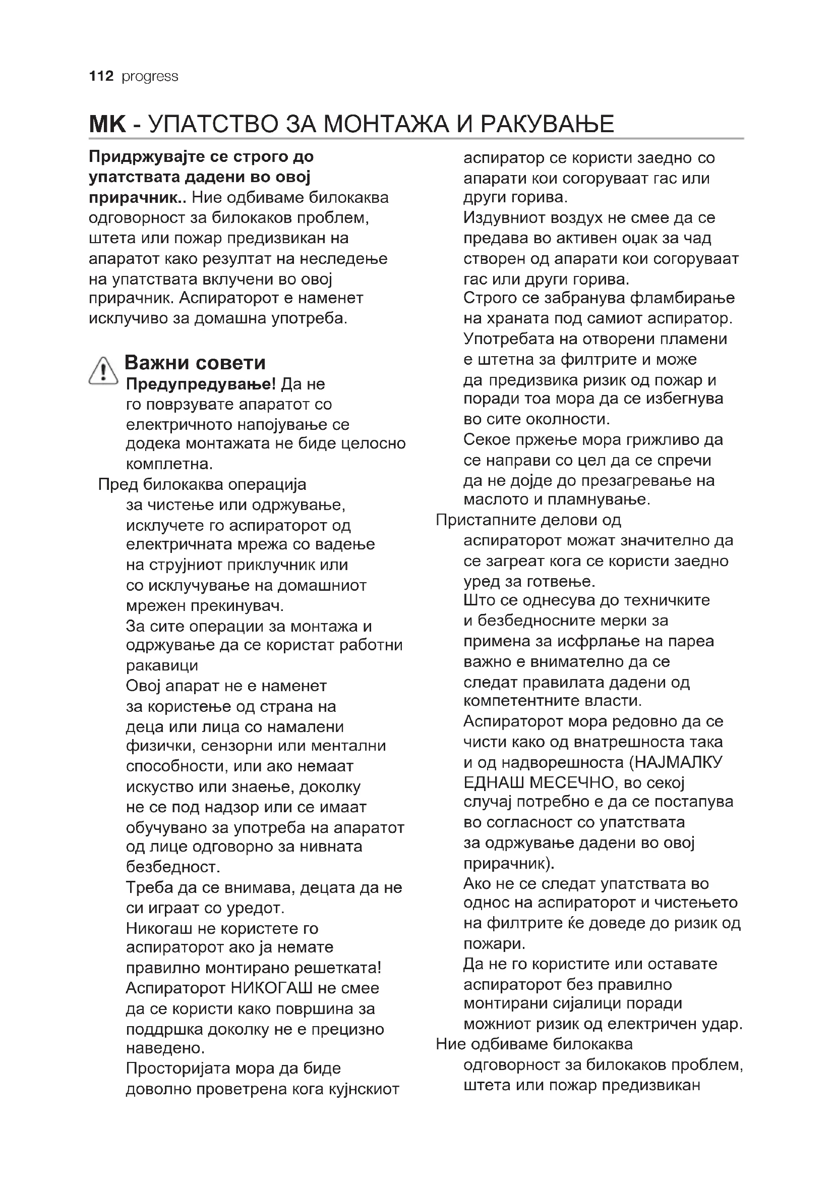 Да не го користите или оставате аспираторот без правилно монтирани сијалици поради можниот ризик од електричен удар. Ние одбиваме билокаква одговорност за билокаков проблем, штета или пожар предизвиканprogress 113 на апаратот како резултат на неследење на упатствата вклучени во овој прирачник. Овој апарат е обележан согласно Европската директива 2002/96/ EC за Искористена Електрична и Електронска Опрема (Waste Electrical and Electronic Equipment - WEEE). Со правилно отстранување на овој производ помагате да се спречат потенцијалните негативни последици за околината и здравјето на човекот, што инаку би се предизвикале од несоодветното третирање како отпадок на овој