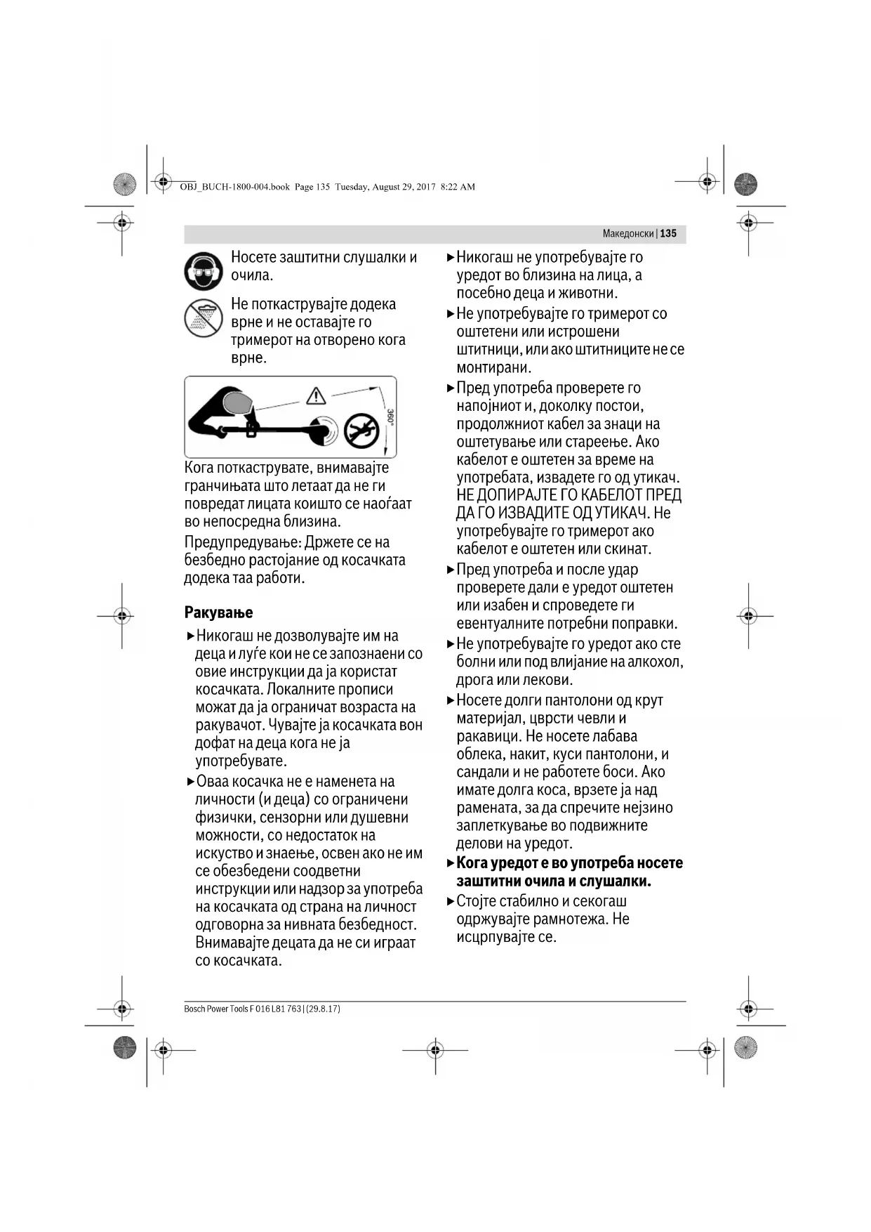 Пред употреба проверете го напојниот и, доколку постои, продолжниот кабел за знаци на оштетување или стареење. Ако кабелот е оштетен за време на употребата, извадете го од утикач. НЕ ДОПИРАЈТЕ ГО КАБЕЛОТ ПРЕД ДА ГО ИЗВАДИТЕ ОД УТИКАЧ. Не употребувајте го тримерот ако кабелот е оштетен или скинат. Пред употреба и после удар проверете дали е уредот оштетен или изабен и спроведете ги евентуалните потребни поправки. Не употребувајте го уредот ако сте болни или под влијание на алкохол, дрога или лекови. Носете долги пантолони од крут материјал, цврсти чевли и ракавици. Не носете лабава облека, накит, куси пантолони, и сандали и не работете боси. Ако имате долга коса, врзете ја над рамената, за да спречите нејзино заплеткување во подвижните делови на уредот. Кога уредот е во употреба носете заштитни очила и слушалки. Стојте стабилно и секогаш одржувајте рамнотежа. Не исцрпувајте се. OBJ_BUCH-1800-004.book Page 135 Tuesday, August 29, 2017 8:22 AM136 | Македонски F 016 L81 763 | (29.8.17) Bosch Power Tools Никогаш не користете го тримерот кога во близина има други лица, а особено деца или животни. Ракувачот е одговорен за штетата нанесена на други луѓе или имот. Почекајте ротирачките елементи на уредот потполно да застанат пред да ги допрете. Сечилото продолжува да ротира и откако моторот на уредот ќе згасне и може да предизвика повреда. Работете само при дневна светлина или при добро осветлување. Не работете со тримерот при лоши временски услови, а посебно при грмотевици. Употребата на тримерот на влажна трева ја намалува неговата ефикасност. Згаснете го уредот кога го пренесувате до и од местото на