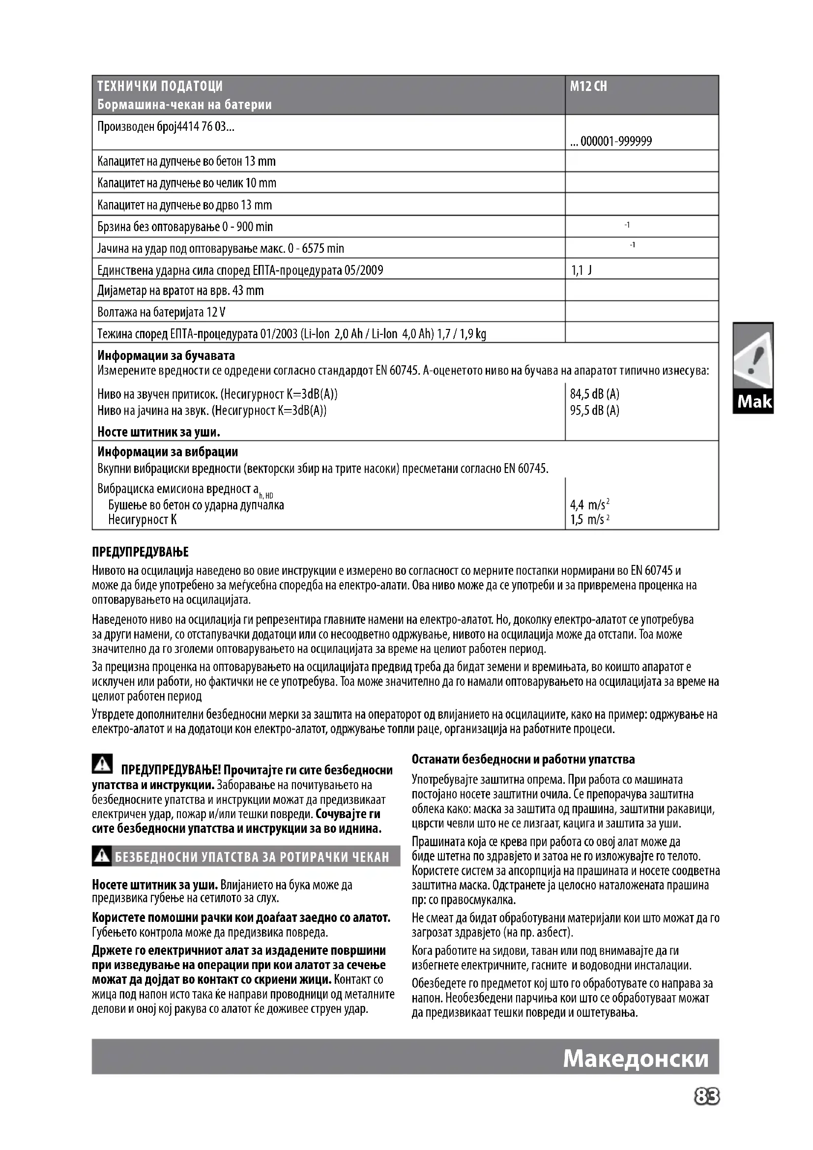 Mak ПРЕДУПРЕДУВАЊЕ! Прочитајте ги сите безбедносни упатства и инструкции. Заборавање на почитувањето на безбедносните упатства и инструкции можат да предизвикаат електричен удар, пожар и/или тешки повреди. Сочувајте ги сите безбедносни упатства и инструкции за во иднина. БЕЗБЕДНОСНИ УПАТСТВА ЗА РОТИРАЧКИ ЧЕКАН Носете штитник за уши. Влијанието на бука може да предизвика губење на сетилото за слух. Користете помошни рачки кои доаѓаат заедно со алатот. Губењето контрола може да предизвика повреда. Држете го електричниот алат за издадените површини при изведување на операции при кои алатот за сечење можат да дојдат во контакт со скриени жици. Контакт со жица под напон исто така ќе направи проводници од металните делови и оној кој ракува со алатот ќе доживее струен удар. Останати безбедносни и работни упатства Употребувајте заштитна опрема. При работа со машината постојано носете заштитни очила. Се препорачува заштитна облека како: маска за заштита од прашина, заштитни ракавици, цврсти чевли што не се лизгаат, кацига и заштита за уши. Прашината која се крева при работа со овој алат може да биде штетна по здравјето и затоа не го изложувајте го телото. Користете систем за апсорпција на прашината и носете соодветна заштитна маска. Одстранете ја целосно наталожената прашина пр: со правосмукалка. Не смеат да бидат обработувани материјали кои што можат да го загрозат здравјето (на пр. азбест). Кога работите на ѕидови, таван или под внимавајте да ги избегнете електричните, гасните и водоводни инсталации. Обезбедете го предметот кој што го обработувате со направа за напон. Необезбедени парчиња кои што се обработуваат можат да предизвикаат тешки повреди и оштетувања. ТЕХНИЧКИ ПОДАТОЦИ Бормашина-чекан на батерии M12 CH Производен број 4414 76 03... ... 000001-999999 Капацитет на дупчење во бетон 13 mm Капацитет на дупчење во челик 10 mm Капацитет на дупчење во дрво 13 mm Брзина без оптоварување 0 - 900 min