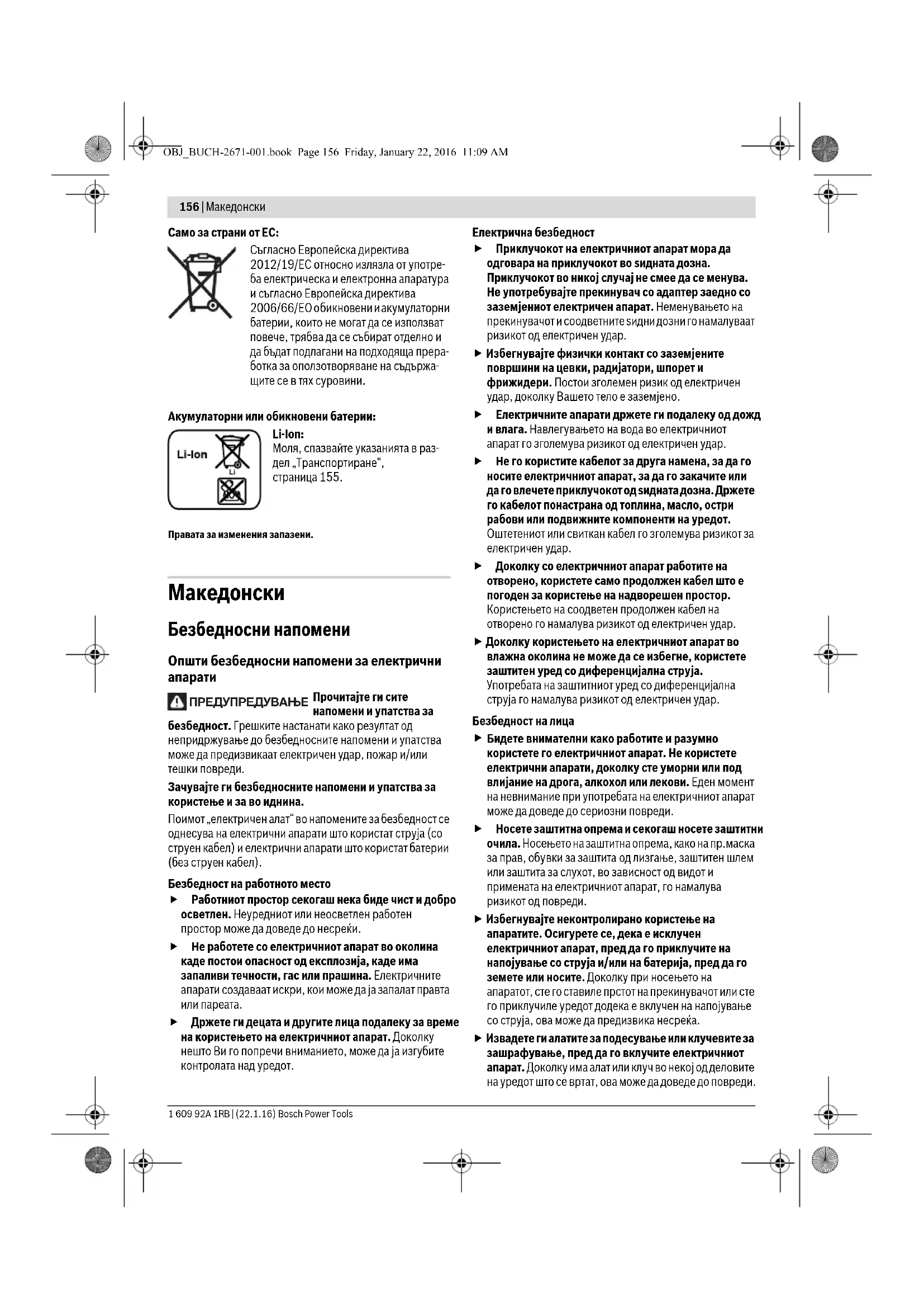 Литиум-јонските батерии подлежат на барањата на Законот за опасни материјали. Батериите може да се транспортираат само од страна на корисникот, без потреба од дополнителни квалификации. При пренос на истите од страна на трети лица (на пр. воздушен транспорт или шпедиција) неопходно е да се внимава на специјалните напомени на амбалажата и ознаките. Во таков случај, при подготовката на пратката мора да се повика експерт за опасни супстанци. OBJ_BUCH-2671-001.book Page 162 Friday, January 22, 2016 11:09 AMSrpski | 163 Bosch Power Tools 1 609 92A 1RB | (22.1.16) Транспортирајте ги батериите само доколку куќиштето е неоштетено. Залепете ги отворените контакти и спакувајте ја батеријата на тој начин што нема да се движи во амбалажата. Ве молиме внимавајте на евентуалните дополнителни национални прописи. Отстранување Електричните апарати, батериите, опремата и амбалажите треба да се отстранат на еколошки прифатлив начин. Не ги фрлајте електричните апарати и батериите во домашната канта за ѓубре! Само за земји во рамки на ЕУ Според европската регулатива 2012/19/EU електричните апарати што се вон употреба и дефектните или искористените батерии според регулативата 2006/66/EC мора одделно да се соберат и да се рециклираат за повторна употреба.