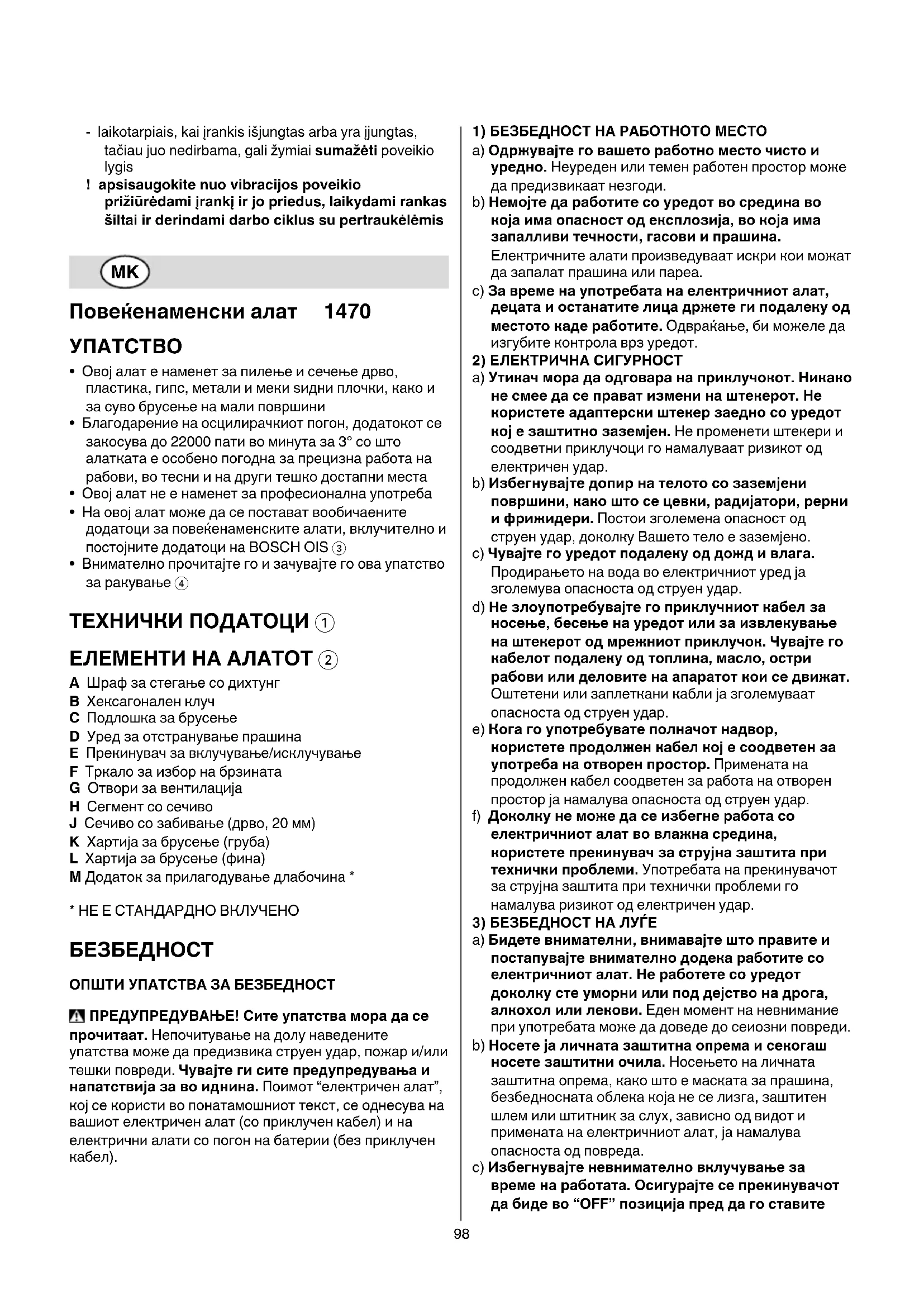 ОПШТИУПАТСТВАЗАБЕЗБЕДНОСТ ПРЕДУПРЕДУВАЊЕ!Ситеупатстваморадасе прочитаат. Непочитување на долу наведените упатства може да предизвика струен удар, пожар и/или тешки повреди. Чувајтегиситепредупредувањаи напатствијазавоиднина. Поимот “електричен алат”, кој се користи во понатамошниот текст, се однесува на вашиот електричен алат (со приклучен кабел) и на електрични алати со погон на батерии (без приклучен