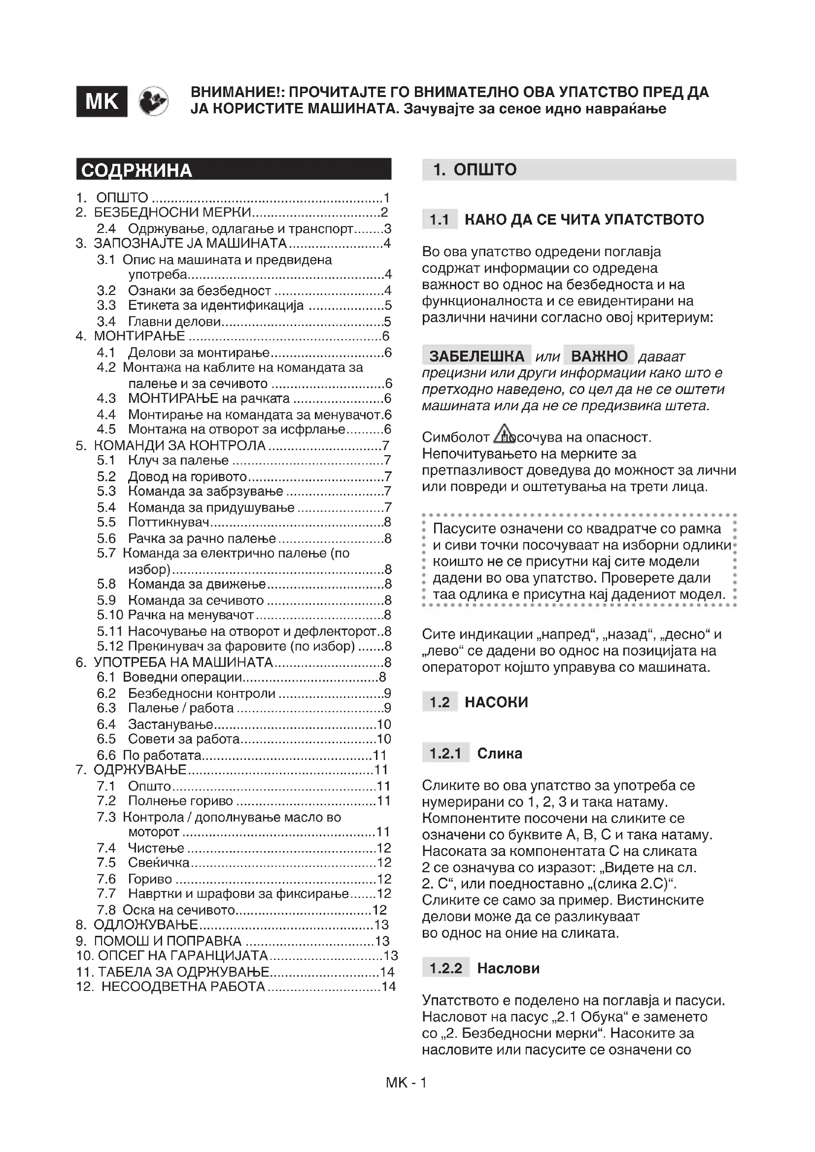Упатството е поделено на поглавја и пасуси. Насловот на пасус „2.1 Обука“ е заменето со „2. Безбедносни мерки“. Насоките за насловите или пасусите се означени со ВНИМАНИЕ!: ПРОЧИТАЈТЕ ГО ВНИМАТЕЛНО ОВА УПАТСТВО ПРЕД ДА ЈА КОРИСТИТЕ МАШИНАТА. Зачувајте за секое идно навраќање