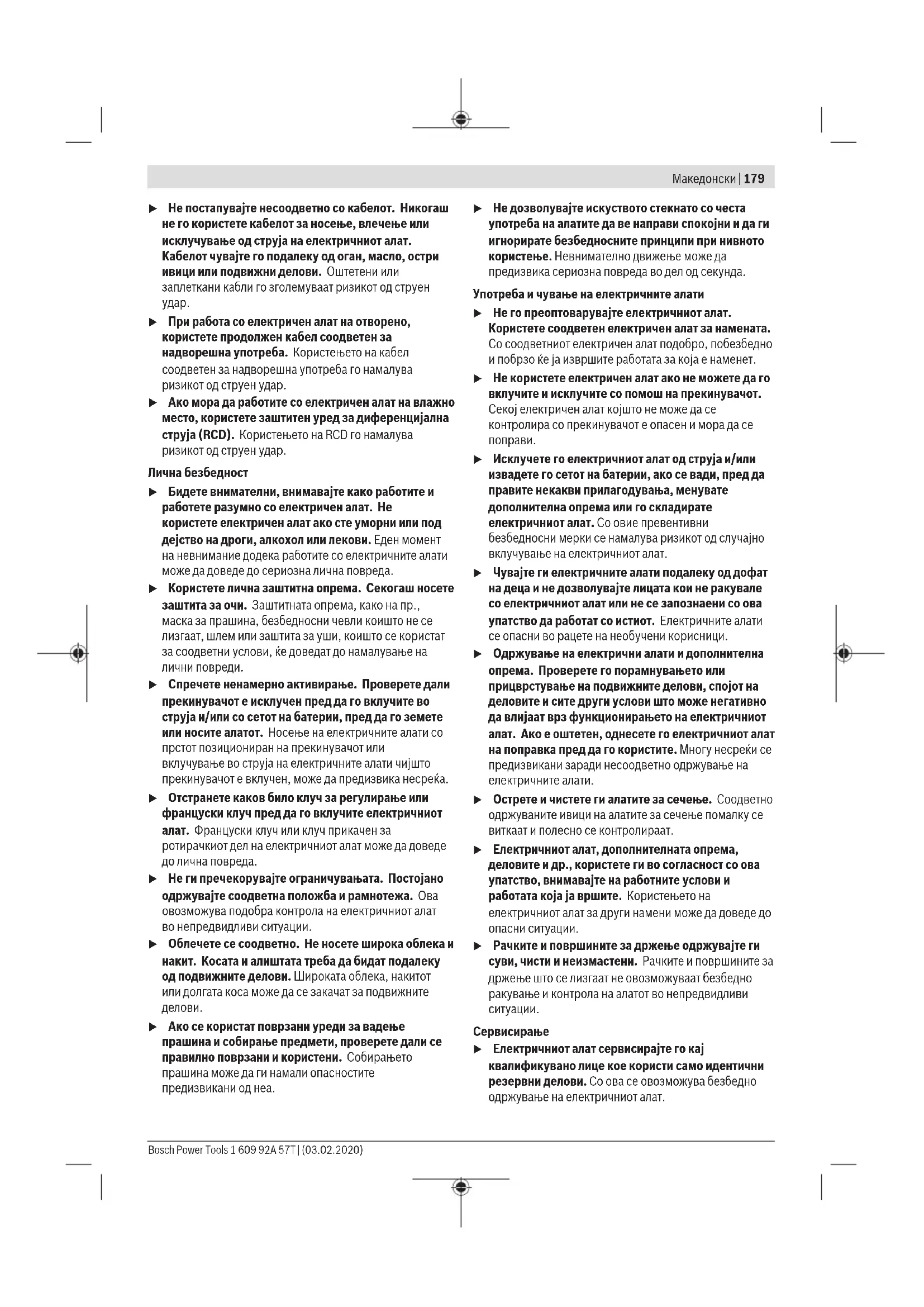 Прочитајте ги сите безбедносни предупредувања, илустрации и спецификации приложени со овој електричен алат. Непридржувањето до сите упатства приложени подолу може да доведе до струен удар, пожар и/или тешки повреди. Зачувајте ги безбедносните предупредувања и упатства за користење и за во иднина. Поимот „електричен алат“ во безбедносните предупредувања се однесува на електрични апарати што користат струја (кабелски) или апарати што користат батерии (акумулаторски). Безбедност на работниот простор u Работниот простор одржувајте го чист и добро осветлен. Преполни или темни простории може да доведат до несреќа. u Не работете со електричните алати во експлозивна околина, како на пример, во присуство на запаливи течности, гасови или прашина. Електричните алати создаваат искри коишто може да ја запалат прашината или гасовите. u Држете ги децата и присутните подалеку додека работите со електричен алат. Невниманието може да предизвика да изгубите контрола. Електрична безбедност u Приклучокот на електричниот алат мора да одговара на приклучницата. Никогаш не го менувајте приклучокот. Не користите приклучни адаптери со заземјените електрични алати. Неизменетите приклучоци и соодветните приклучници го намалуваат ризикот од струен удар. u Избегнувајте телесен контакт со заземјени површини, како на пример, цевки, радијатори, метални ланци и ладилници. Постои зголемен ризик од струен удар ако вашето тело е заземјено. u Не ги изложувајте електричните алати на дожд или влажни услови. Ако влезе вода во електричниот алат, ќе се зголеми ризикот од струен удар. 1 609 92A 57T | (03.02.2020) Bosch Power ToolsМакедонски | 179 u Не постапувајте несоодветно со кабелот. Никогаш не го користете кабелот за носење, влечење или исклучување од струја на електричниот алат. Кабелот чувајте го подалеку од оган, масло, остри ивици или подвижни делови. Оштетени или заплеткани кабли го зголемуваат ризикот од струен