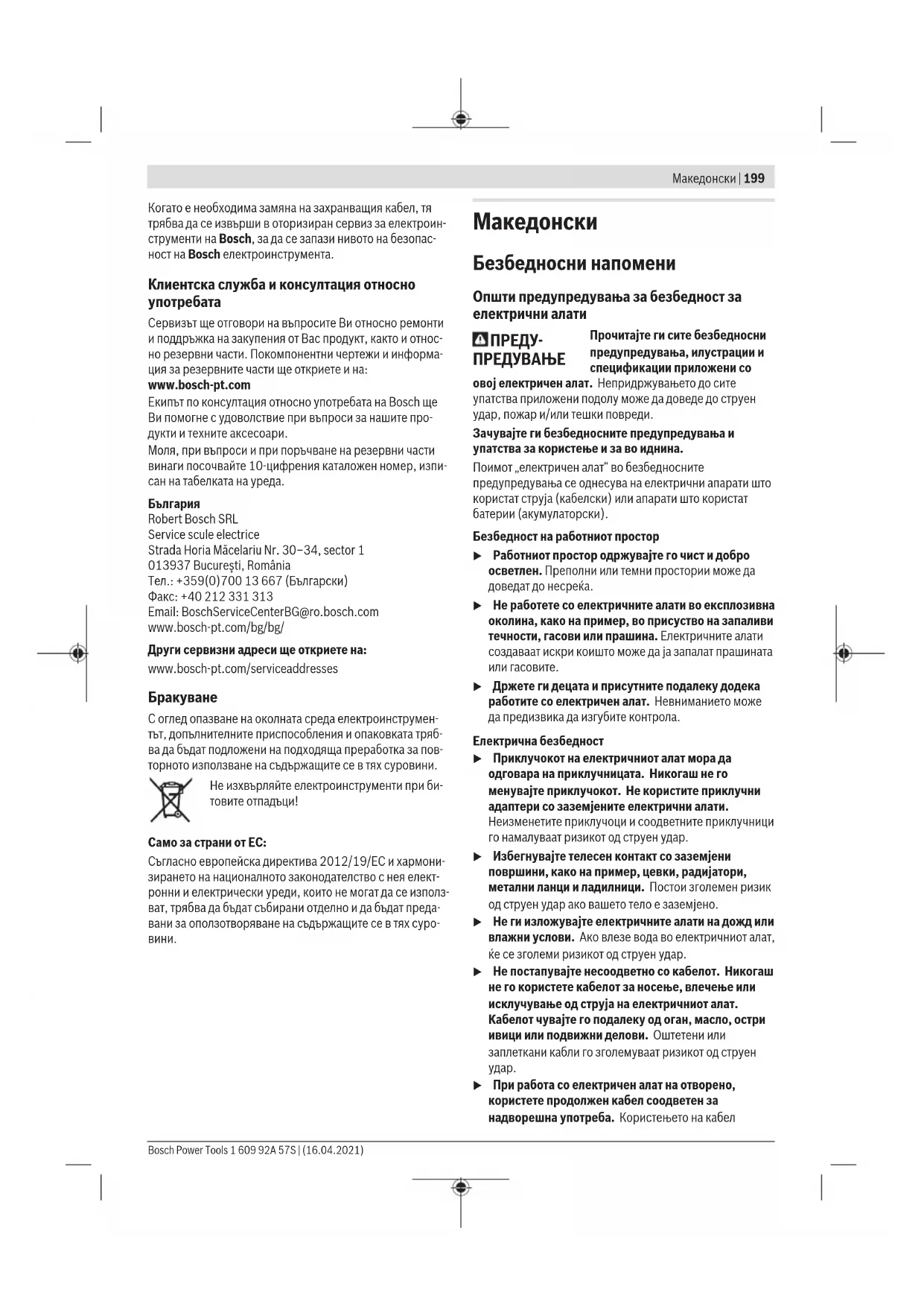 u При екстремни услови на примена, доколку е возможно секогаш користете уред за вшмукување. Чистете ги почесто отворите за проветрување со една четка и приклучете заштитен прекинувач за диференцијална струја (PRCD). При обработка на метали, во внатрешноста на електричниот алат може да се собере спроводлива прав. Може да се оштети заштитната изолација на електричниот алат. Доколку е потребно користење на приклучен кабел, тогаш набавете го од Bosch или специјализирана продавница за Bosch-електрични алати, за да избегнете загрозување на безбедноста. Сервисна служба и совети при користење Сервисната служба ќе одговори на Вашите прашања во врска со поправката и одржувањето на Вашиот производ како и резервните делови. Ознаки за експлозија и информации за резервните делови исто така ќе најдете на: www.bosch-pt.com Тимот за советување при користење на Bosch ќе ви помогне доколку имате прашања за нашите производи и