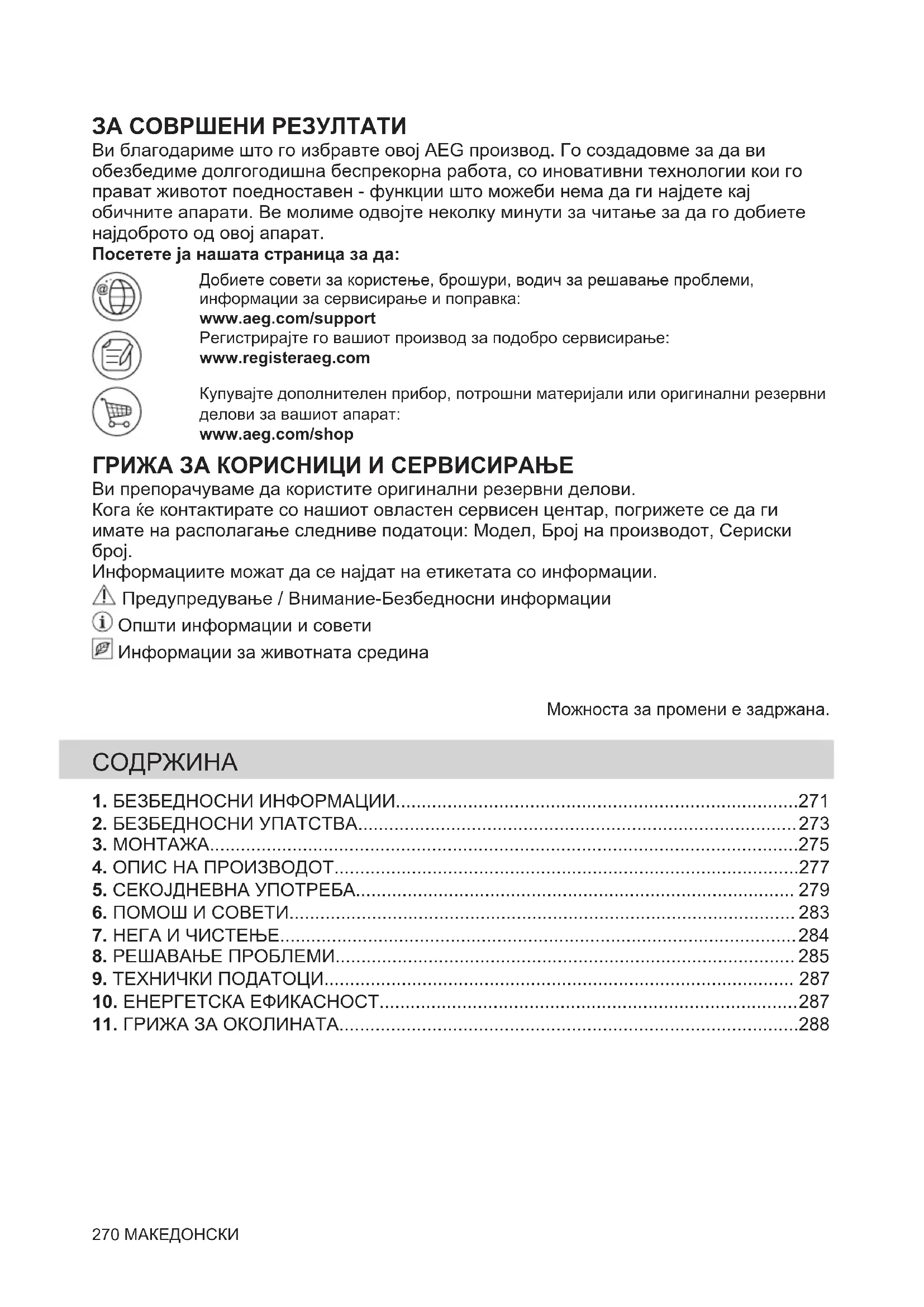 270 МАКЕДОНСКИ1. БЕЗБЕДНОСНИ ИНФОРМАЦИИ Пред монтирање и користење на апаратот, ве молиме внимателно да ги прочитате приложените упатства. Производителот не сноси одговорност за направена повреда или штета кои се резултат на неправилна монтажа или употреба. Секогаш чувајте ги упатствата на сигурно и безбедно место за подоцнежна употреба.