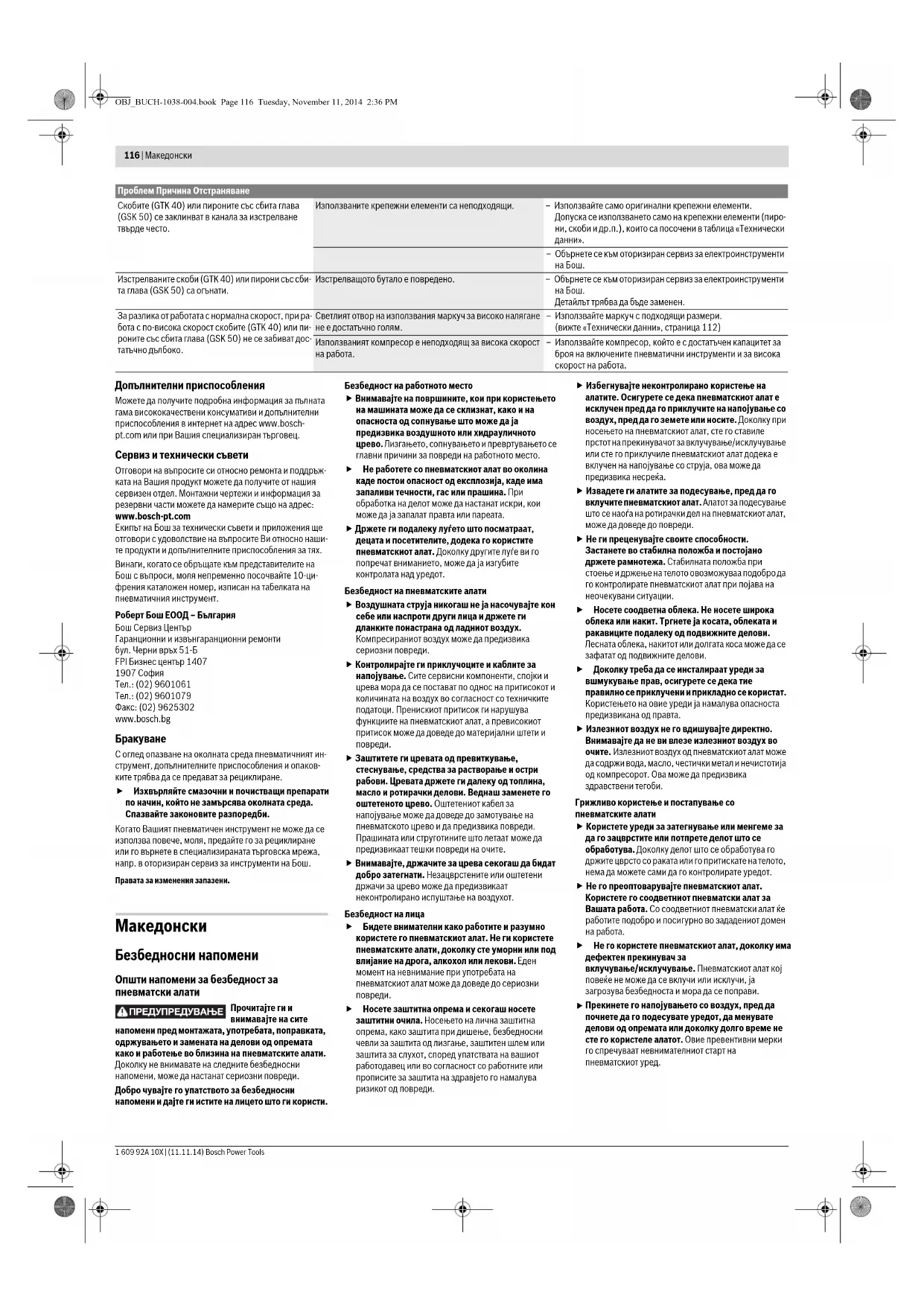 – Използвайте компресор, който е с достатъчен капацитет за броя на включените пневматични инструменти и за висока скорост на работа. Проблем Причина Отстраняване ПРЕДУПРЕДУВАЊЕ OBJ_BUCH-1038-004.book Page 116 Tuesday, November 11, 2014 2:36 PMBosch Power Tools 1 609 92A 10X | (11.11.14) Македонски | 117 Чувајте ги подалеку од дофатот на деца пневматските алати кои не ги користите. Овој пневматски алат не смее да го користат лица кои не се запознаени со него или не ги имаат прочитано овие упатства. Пневматските алати се опасни, доколку ги користат неискусни лица. Одржувајте ги грижливо пневматските алати. Проверете дали подвижните делови функционираат беспрекорно и не се заглавени, дали се скршени или оштетени, што може да ја попречи функцијата на електричниот алат. Поправете ги оштетените делови пред користењето на пневматскиот алат. Многу несреќи својата причина ја имаат во лошо одржуваните пневматски алати. Алатот за сечење одржувајте го остар и чист. Внимателно одржуваните алати за сечење со остри рабови за сечење помалку се заглавуваат и со нив полесно се работи. Користете ги пневматските алати, опремата, додатоците за алатите итн. во согласност со ова упатство. Притоа земете ги во обѕир работните услови и дејноста што треба да се изврши. На тој начин создавањето прав, вибрациите и создавањето бучава ќе се намалат што е можно повеќ