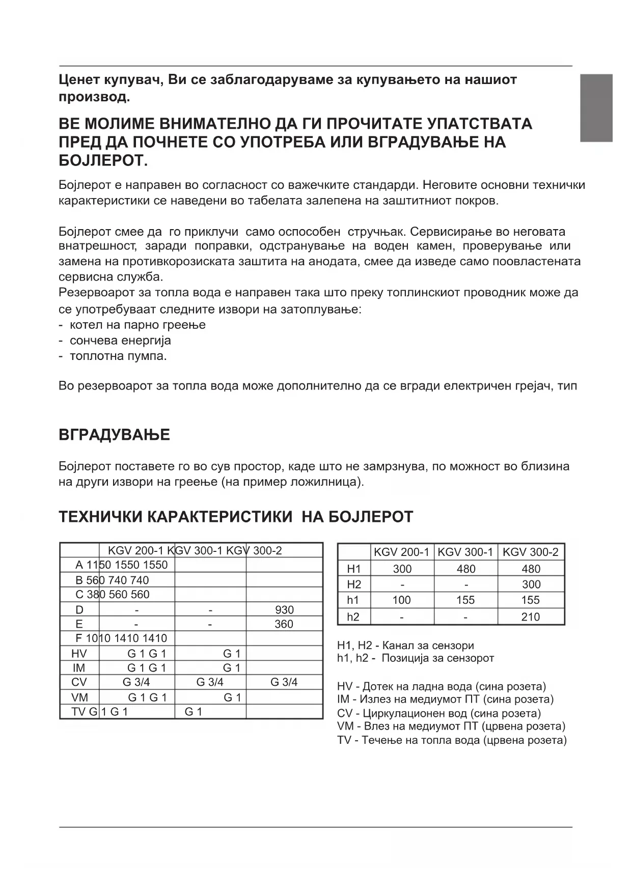 Тип KGV 200-1 KGV 300-1 KGV 300-2 Зафатнина [l] 200 285 280 Номинален притисок [MPa] 0,6 Тежина / наполнет со вода [kg] 82 / 282 112 / 397 134 / 414 Противкорозиона заштита на котелот Емајлиран / Mq анода Загревана површина ПT-долен [m²] Bолумен ПT-горен [l] Дебелина на изолацијата [mm] 57 Степен заштите IP 21 ПТ - Пренесување на топлина На задната страна на резервоарот за топла вода се направени канали за сензори (H1, H2), каде можат да се стават сензори за регулација на системското поврзување на резервоарот за топла вода со другите извори на затоплување. Пристапот до каналите e под прекривачкиот спој на заштитниот покривач, приближно на половина висина од резервоарот за топла вода. Ставете го сензорот во каналот и фиксирајте го со приложениот гумен чеп. Препорачаната позиција (h1, h2) за сензорот во каналите е означена на скицата: - ако го поставите сензорот повисоко од препорачаната позиција, термостатот ќе реагира побргу, периодите на работа на проточната пумпа ќе бидат пократки, разликата меѓу температурата на водата во резервоарот и медиумот што загрева, ќе биде поголема по исклучувањето на термостатот, затоа количината и температурата на топлата вода во резервоарот ќе биде пониска, - ако го поставите сензорот пониско од препорачаната позиција, периодите на работа на проточната пумпа ќе бидат подолги, разликата меѓу температурата на медиумот што загрева, и постигната температура на водата во резервоарот ќе биде пониска, а со тоа и количината на водата во грејачот ќе биде нешто повисока.