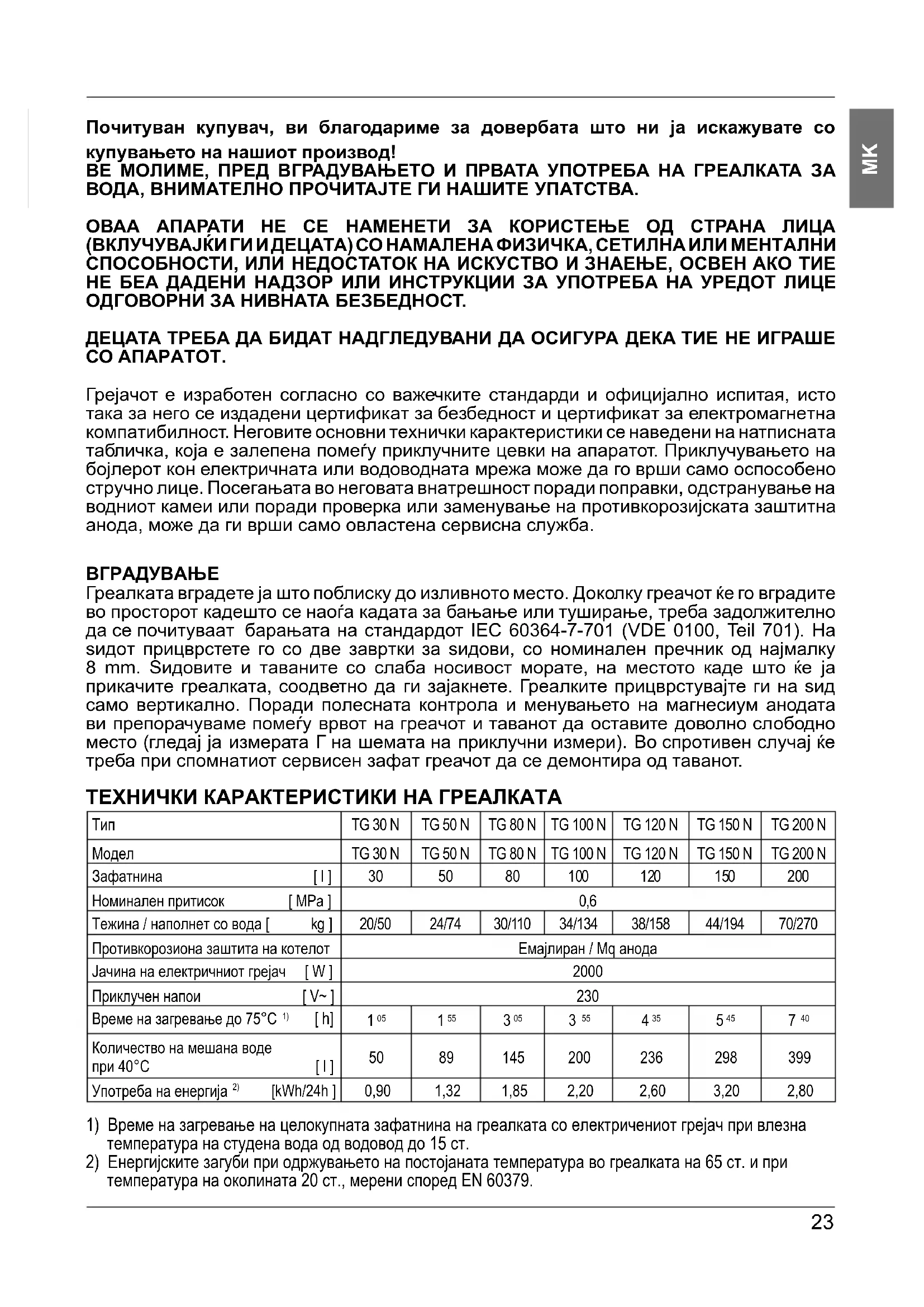 Греалката вградете ја што поблиску до изливното место. Доколку греачот ќе го вградите во просторот кадешто се наоѓа кадата за бањање или туширање, треба задолжително да се почитуваат барањата на стандардот IEC 60364-7-701 (VDE 0100, Teil 701). На ѕидот прицврстете го со две завртки за ѕидови, со номинален пречник од најмалку 8 mm. Ѕидовите и таваните со слаба носивост морате, на местото каде што ќе ја прикачите греалката, соодветно да ги зајакнете. Греалките прицврстувајте ги на ѕид само вертикално. Поради полесната контрола и менувањето на магнесиум анодата ви препорачуваме помеѓу врвот на греачот и таванот да оставите доволно слободно место (гледај ја измерата Г на шемата на приклучни измери). Во спротивен случај ќе треба при спомнатиот сервисен зафат греачот да се демонтира од таванот. ТЕХНИЧКИ КАРАКТЕРИСТИКИ НА ГРЕАЛКАТА Тип TG 30 N TG 50 N TG 80 N TG 100 N TG 120 N TG 150 N TG 200 N Модел TG 30 N TG 50 N TG 80 N TG 100 N TG 120 N TG 150 N TG 200 N Зафатнина [ l ] 30 50 80 100 120 150 200 Номинален притисок [ MPа ] 0,6 Тежина / наполнет со вода [ kg ] 20/50 24/74 30/110 34/134 38/158 44/194 70/270 Противкорозиона заштита на котелот Емајлиран / Мq анода Јачина на електричниот грејач [ W ] 2000 Приклучен напои [ V~ ] 230 Време на загревање до 75°C